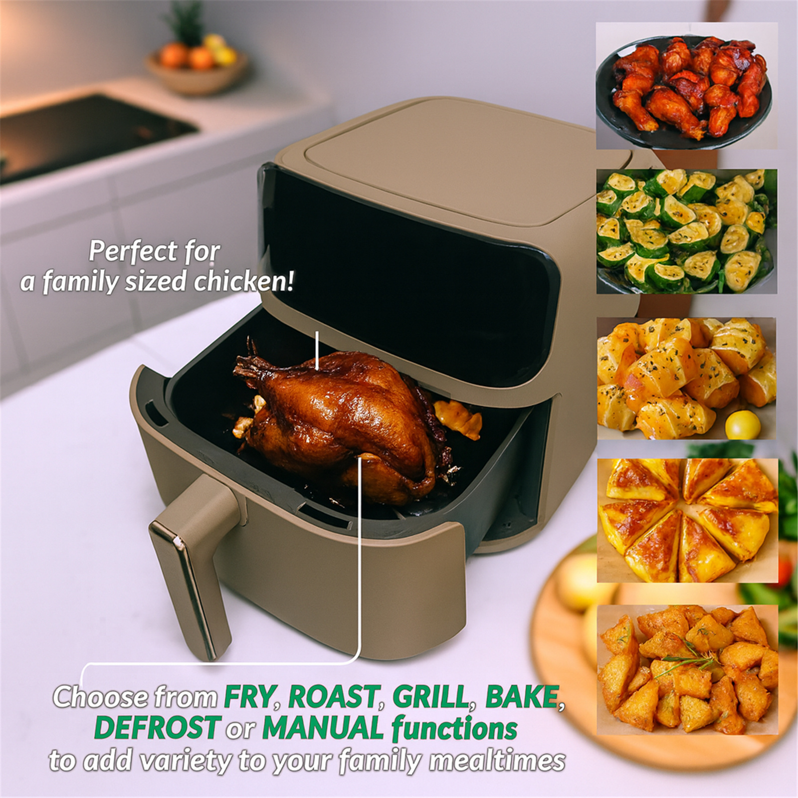 - Healthy Cooking: Enjoy crispy, delicious food with significantly less oil, thanks to rapid air circulation technology.