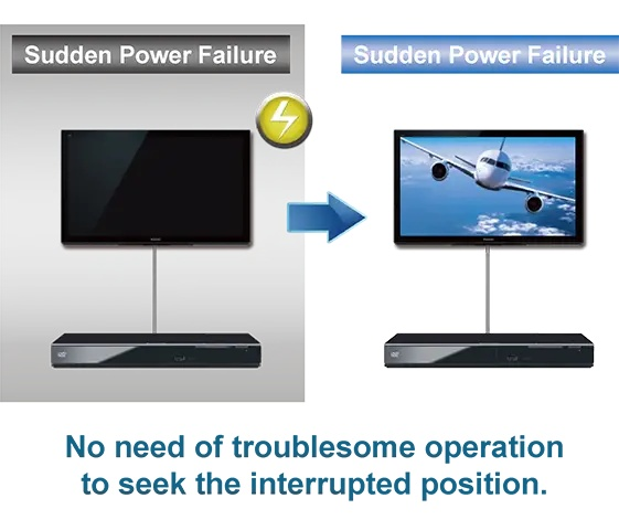 You can resume your DVD from where it's stopped, even after a power failure. *There may be about a 10 second difference from the actual point where the power was cut off. The power resume feature automatically creates and stores the chapter mark on certain intervals during playback of the contents, in order to playback from the latest chapter marked, when resumed from power supply problems. Please kindly note this feature does not playback from the exact scene which was interrupted upon power supply problems.