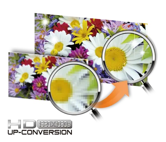 1080p Up-Conversion raises image quality by correcting, in pixel units, the brightness signals of images in recorded content, DVD movies, and other media.