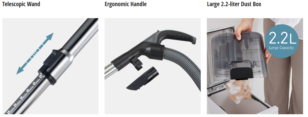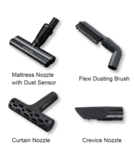 - Attachments: Mattress Nozzle with Dust Sensor / Curtain Nozzle / Flexi Dusting Brush / Crevice Nozzle