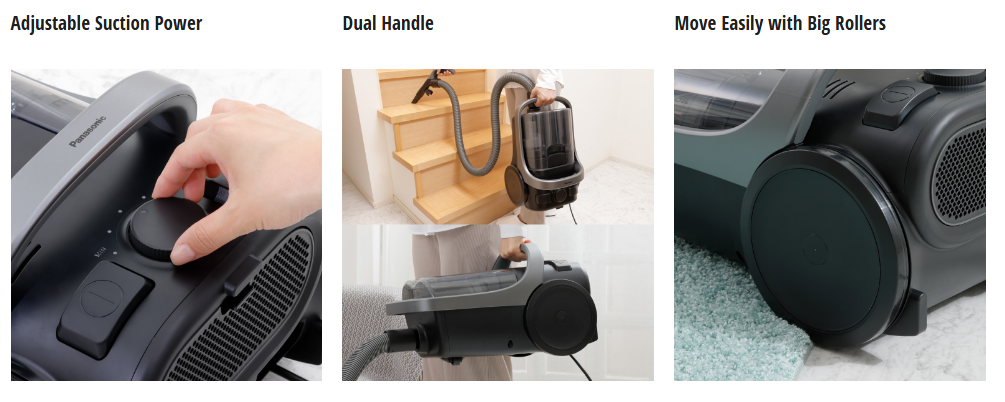 This range of Panasonic vacuum cleaners provides a clean air exhaust via a 7-layer filtration system with HEPA. 4 versatile attachments for hard-to-reach and clean areas, while the powerful suction ensures efficient cleaning.