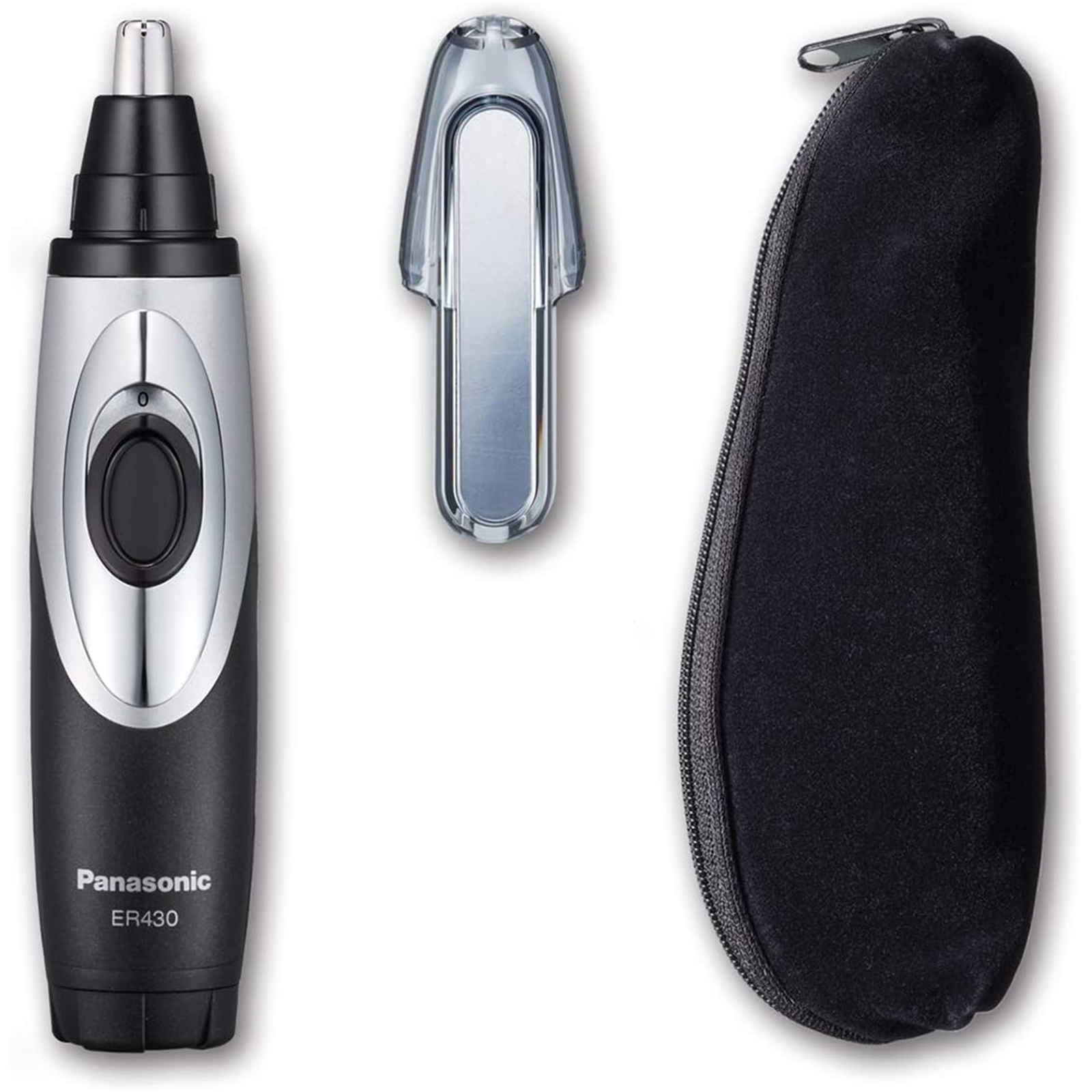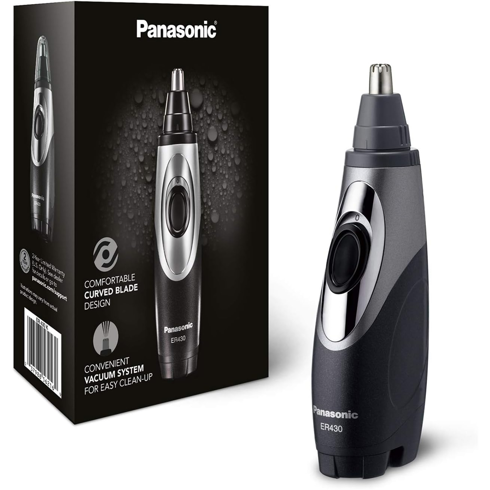 Portable and battery-powered, the Panasonic Nose Hair Trimmer and Ear Hair Trimmer ER430K with Vacuum Cleaning System neatly trims away ear, nose and eyebrow hair, and details mustache, sideburns and beard, while a micro-vacuum system collects clippings for simple clean-up.