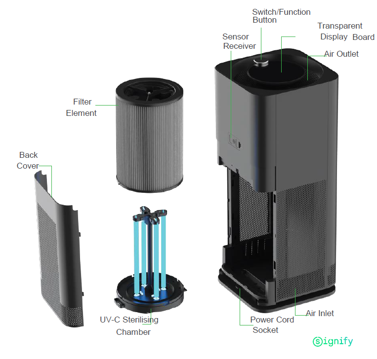 Philips UV-C air disinfection unit actively disinfects it using our state of the art UVC technology.