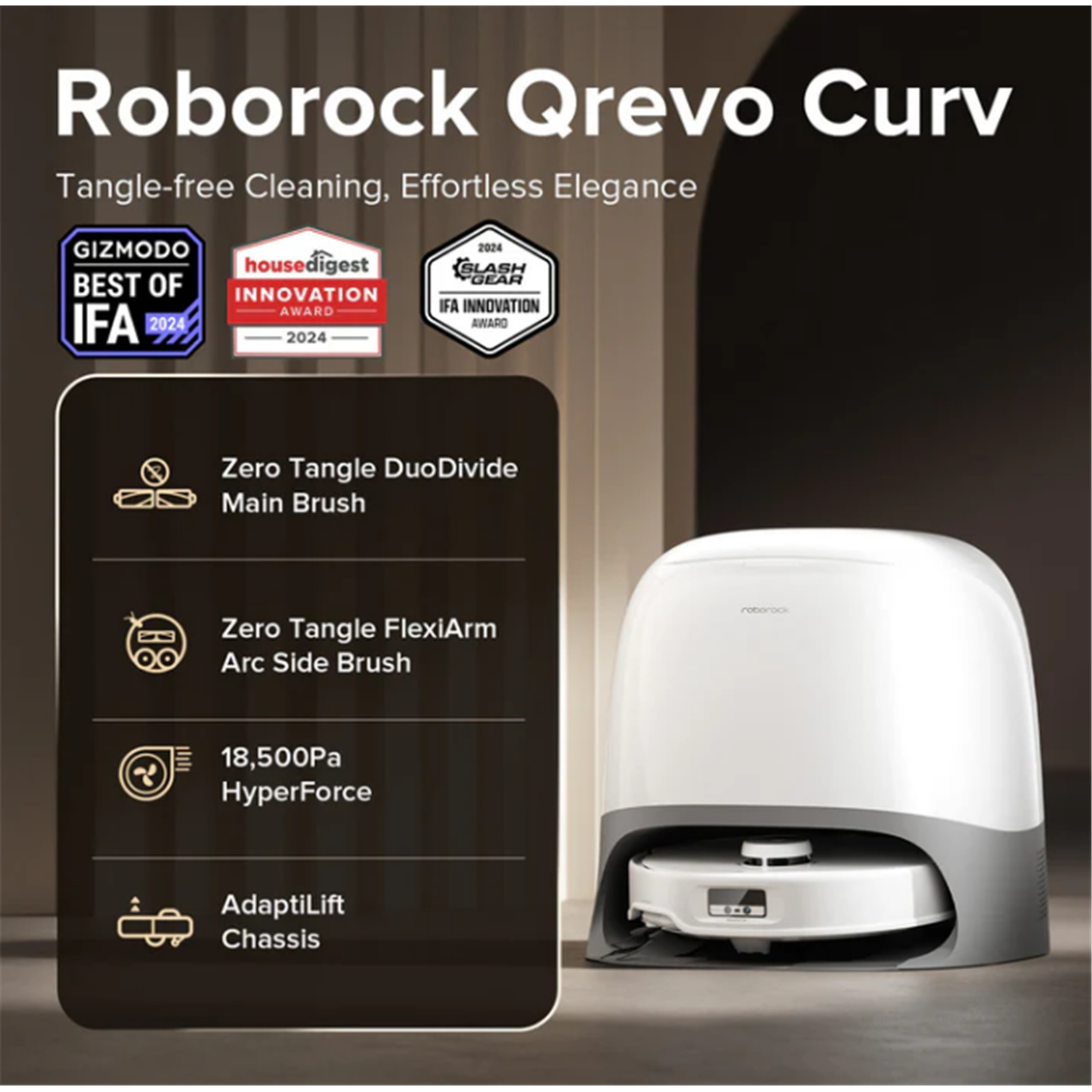 Meet Roborock Qrevo Curv, blending elegance and innovation. The Dual Anti-Tangle System and AdaptiLift™ Chassis ensure exceptional performance by preventing hair tangles and adapting to various floor types for comprehensive, hassle-free cleaning. With 18,500 Pa HyperForce® suction and FlexiArm™ Technology, every corner is spotless. Let Roborock Qrevo Curv bring warmth and unmatched performance to your home.