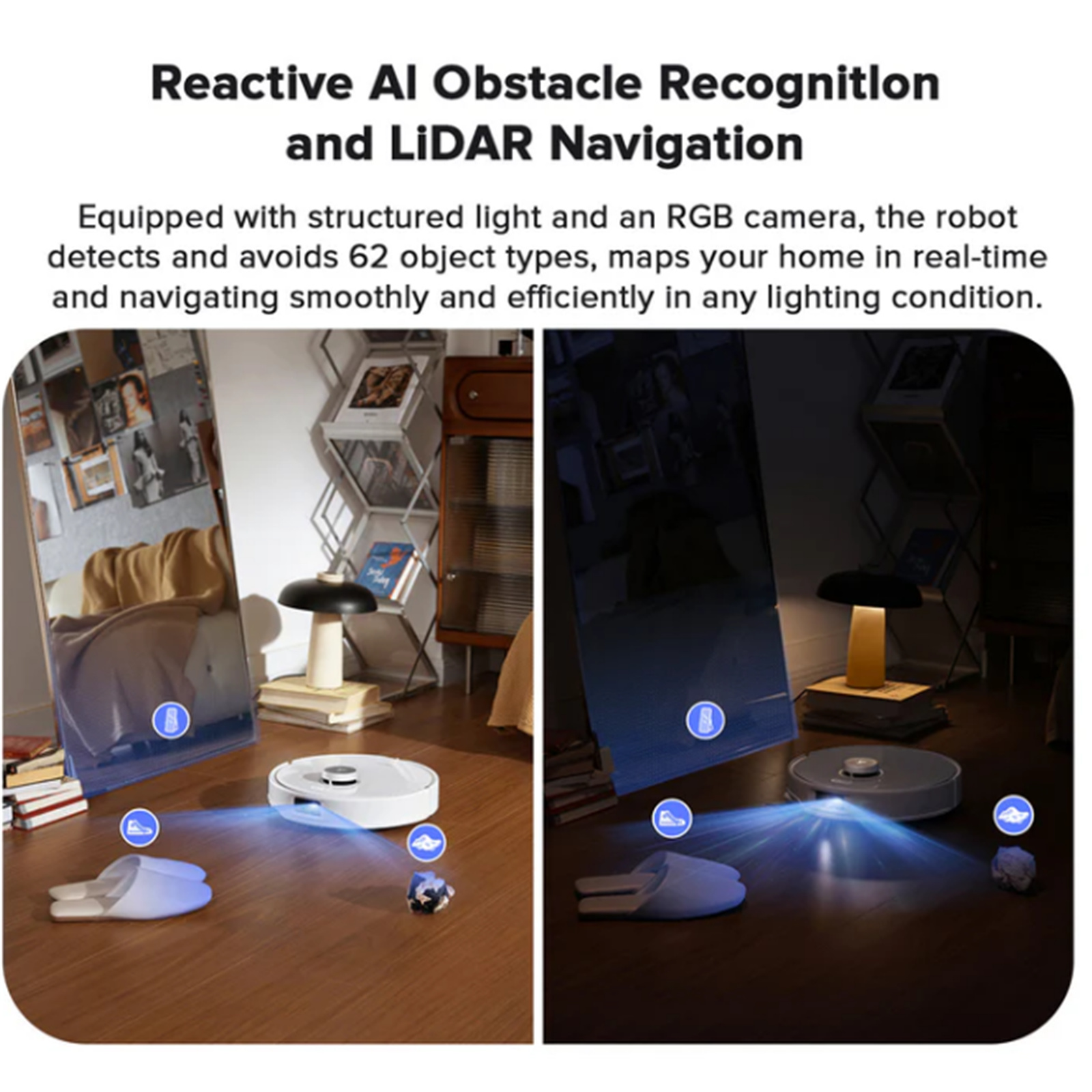 Equipped with structured light and an RGB camera, the robot detects and avoids 62 object types*. It smoothly navigates around obstacles in both bright and dark environments, reducing the need for manual intervention.