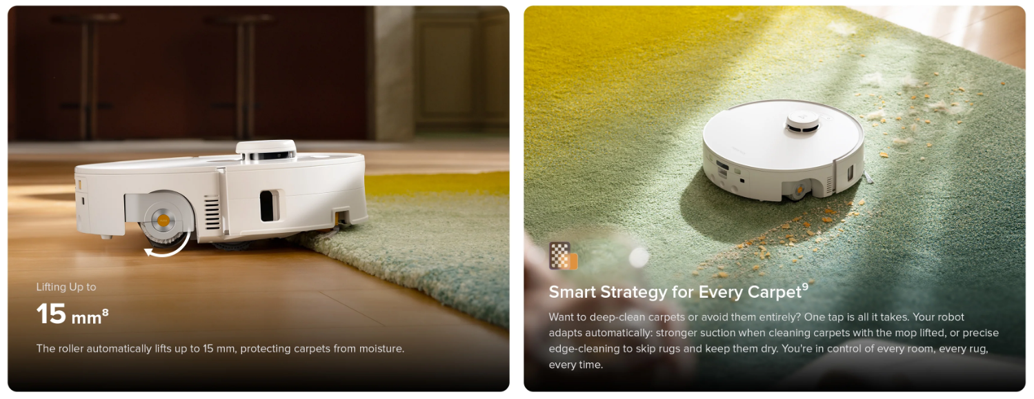 As the robot approaches your carpet, the roller lifts to avoid contact, while the Innovative Roller Shield automatically deploys, forming a pysical barrier that blocks moisture and dirt this multi-layer safeguard ensures true wet-and -dry separation, keeping your carpets dry and clean with ease.