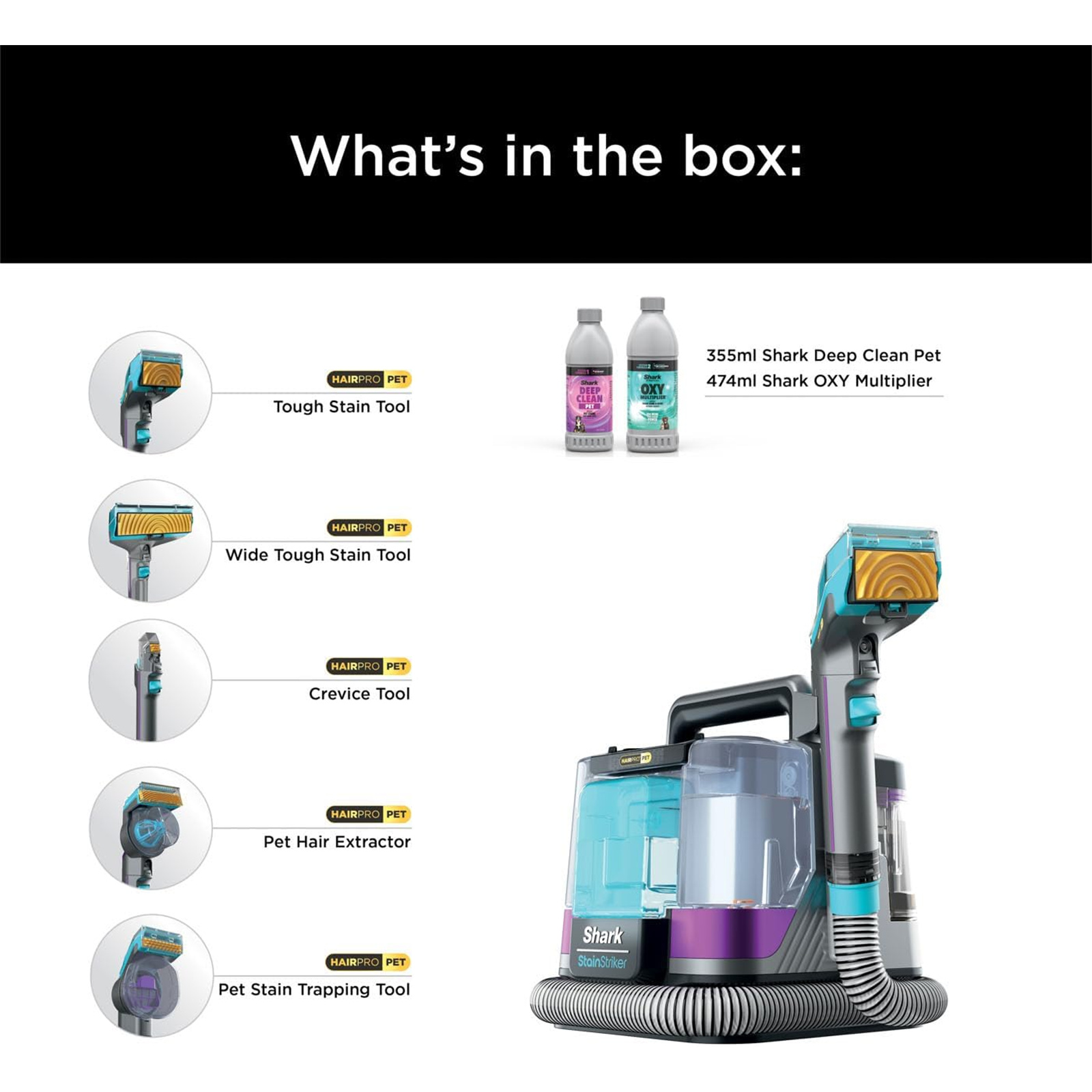 Shark's dual-activated cleaning solution combines two bespoke cleaning formulas, which mix and activate inside the handheld tool to deliver 20x more stain-striking power*. No heat or pre-treat required. Shark Deep Clean Pet Formula removes layers of ground-in dirt and grime. StainStriker OXY Multiplier Formula lifts and extracts stubborn pet stains and odours, unleashing the power of OXY to eliminate tough stains. Your StainStriker includes a starter bottle of each formula. Refills are available to purchase separately.