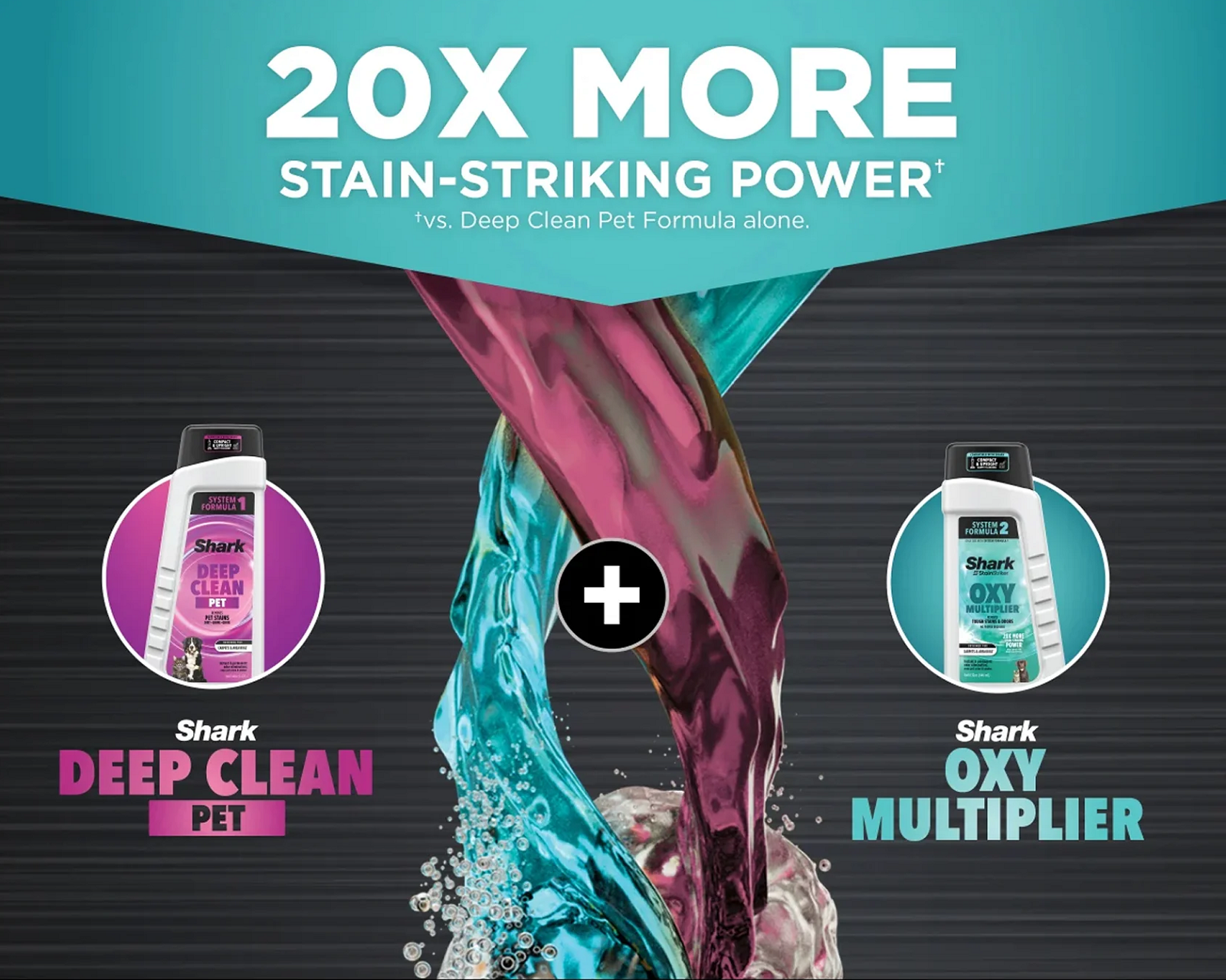 Shark's StainStriker Oxy Multiplier formula lifts and extracts stubborn stains and odours, mixing together with Shark's CarpetXpert Deep Clean Pro Formula and activating as you clean, targeting and removing even the toughest stains.