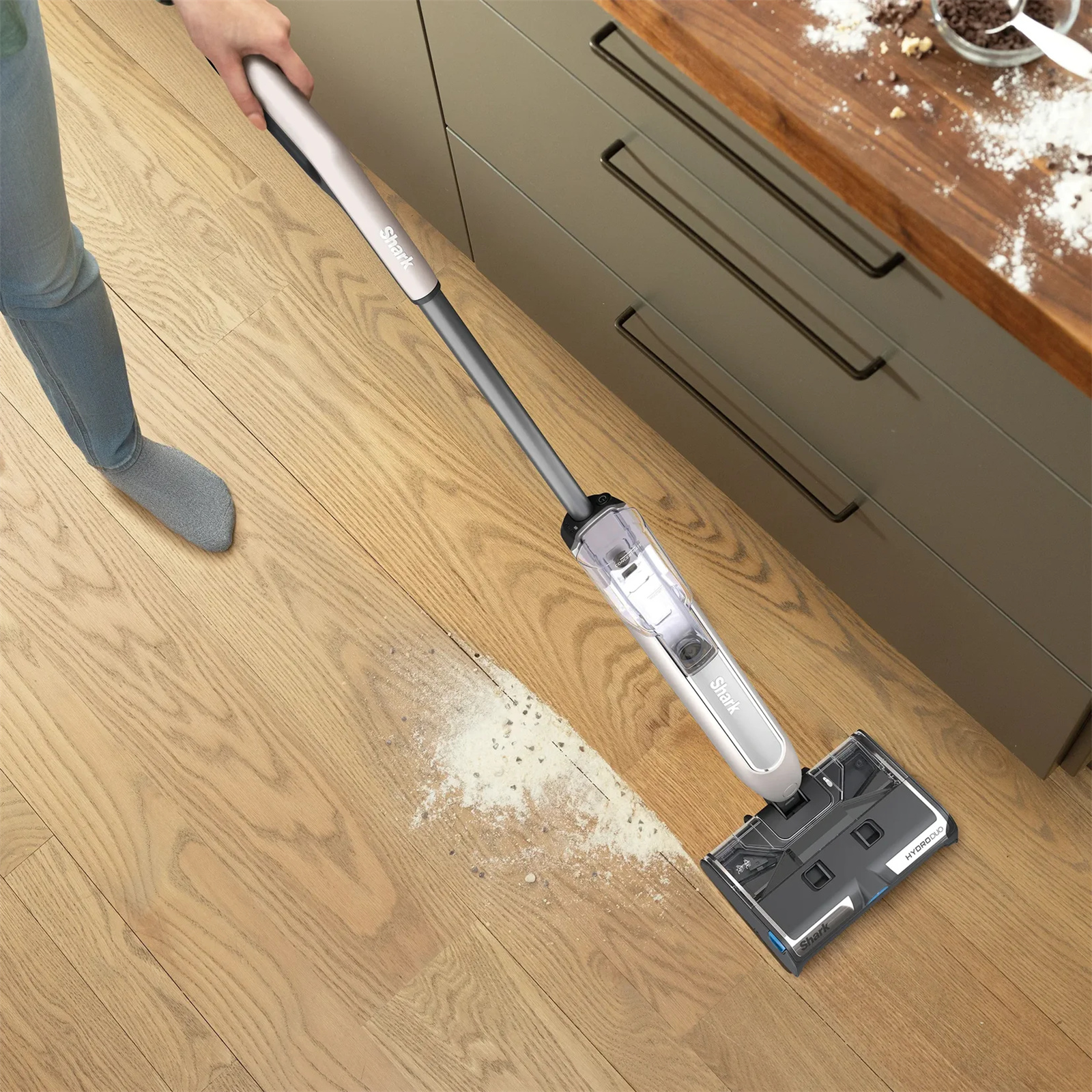 Shark® HydroDuo™ with Dirt-Reveal Technology™ is a cordless hard floor cleaning system that picks up both wet and dry debris, mops, and scrubs-all at once, ideal for every day, grab-and-go cleaning. Tackle stuck-on messes with the on-demand spray or pick up dry messes and debris without having to wet your floors. Use on sealed hard floors including hardwood, tile, marble, stone, laminate, and more.