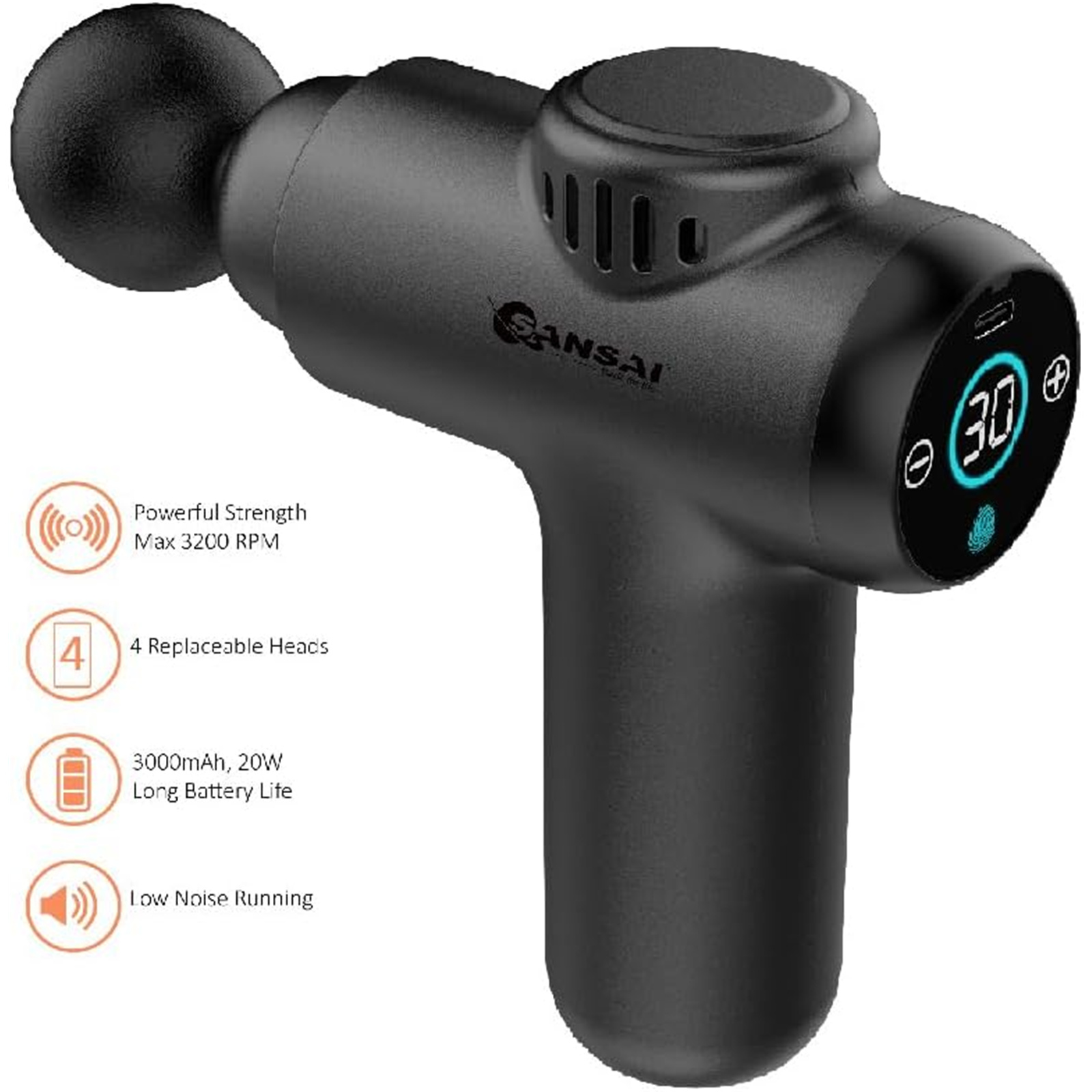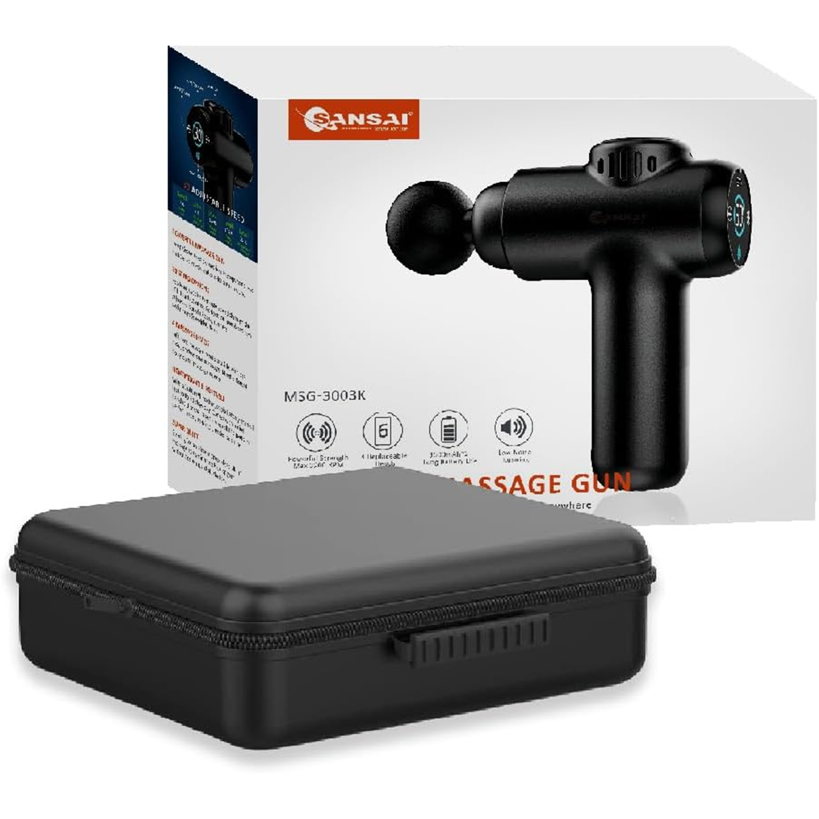 The Sansai MSG-3003K Muscle Massage Gun in sleek black is designed to deliver powerful and versatile muscle relief with its 20W brush motor and 3000mAh rechargeable battery, ensuring extended usage with a quick 2.5-hour charge time. Featuring 4 professional-grade massage heads, this device offers targeted treatment for various muscle groups and maximizes comfort with 30 adjustable speed levels, ranging from 1200 to 3200 rpm, allowing for customizable intensity. The user-friendly LCD touch screen makes adjustments simple, while the portable storage bag ensures convenient transport and storage. This massage gun package includes 4 massage heads-Round, Taper, Flat, and U-Shape-for tailored relief, plus an AC charger and user manual for easy setup and operation.