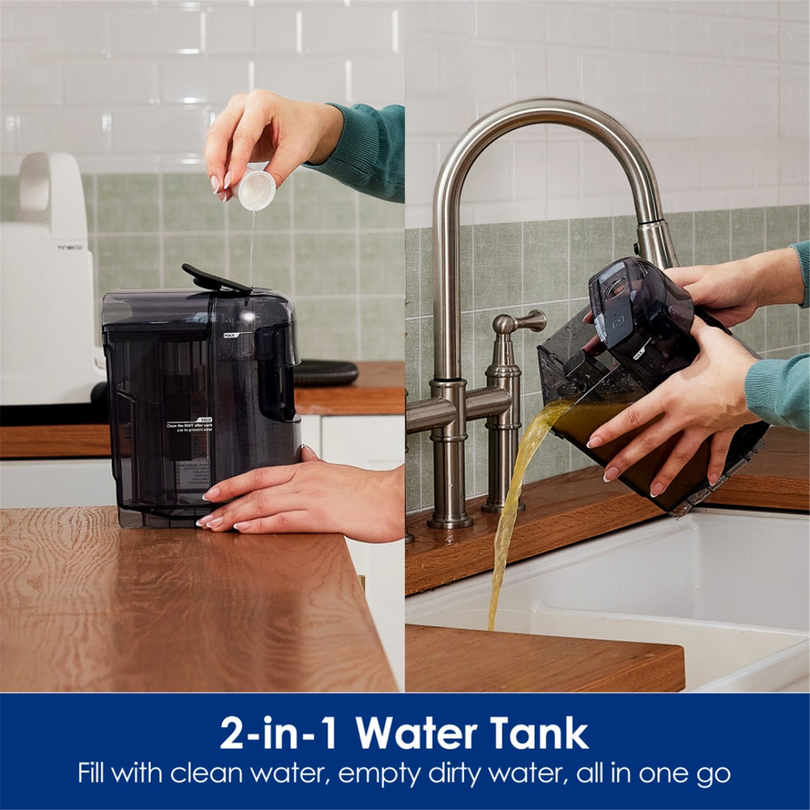 - Double water tanks, to separate clean water and dirty water. Ensures cleaning always uses clean water. Both tanks are easy to remove, empty and refill.