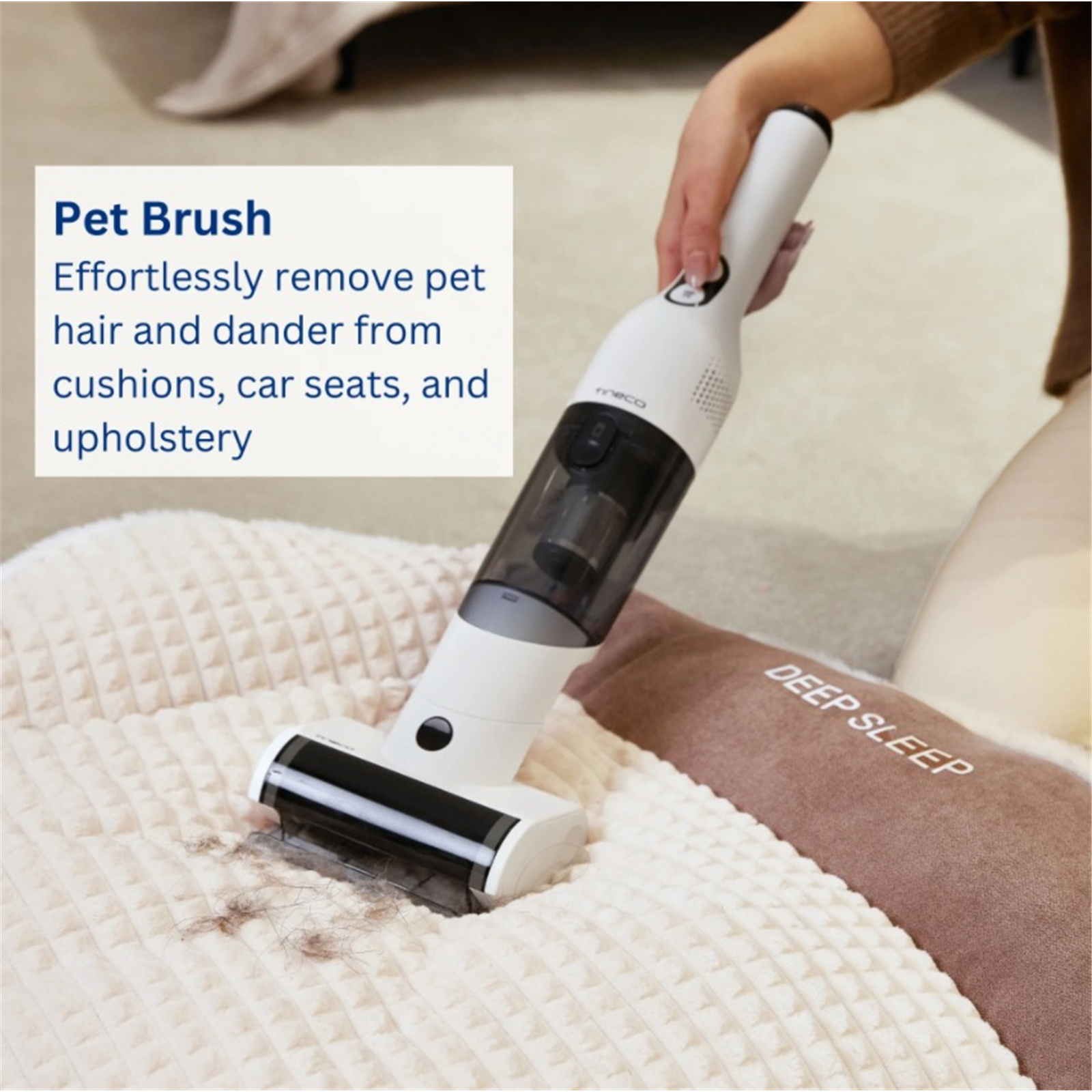 Equipped with a specialized Pet Brush, it effortlessly removes pet hair and dander from couch cushions, car seats, and upholstery.