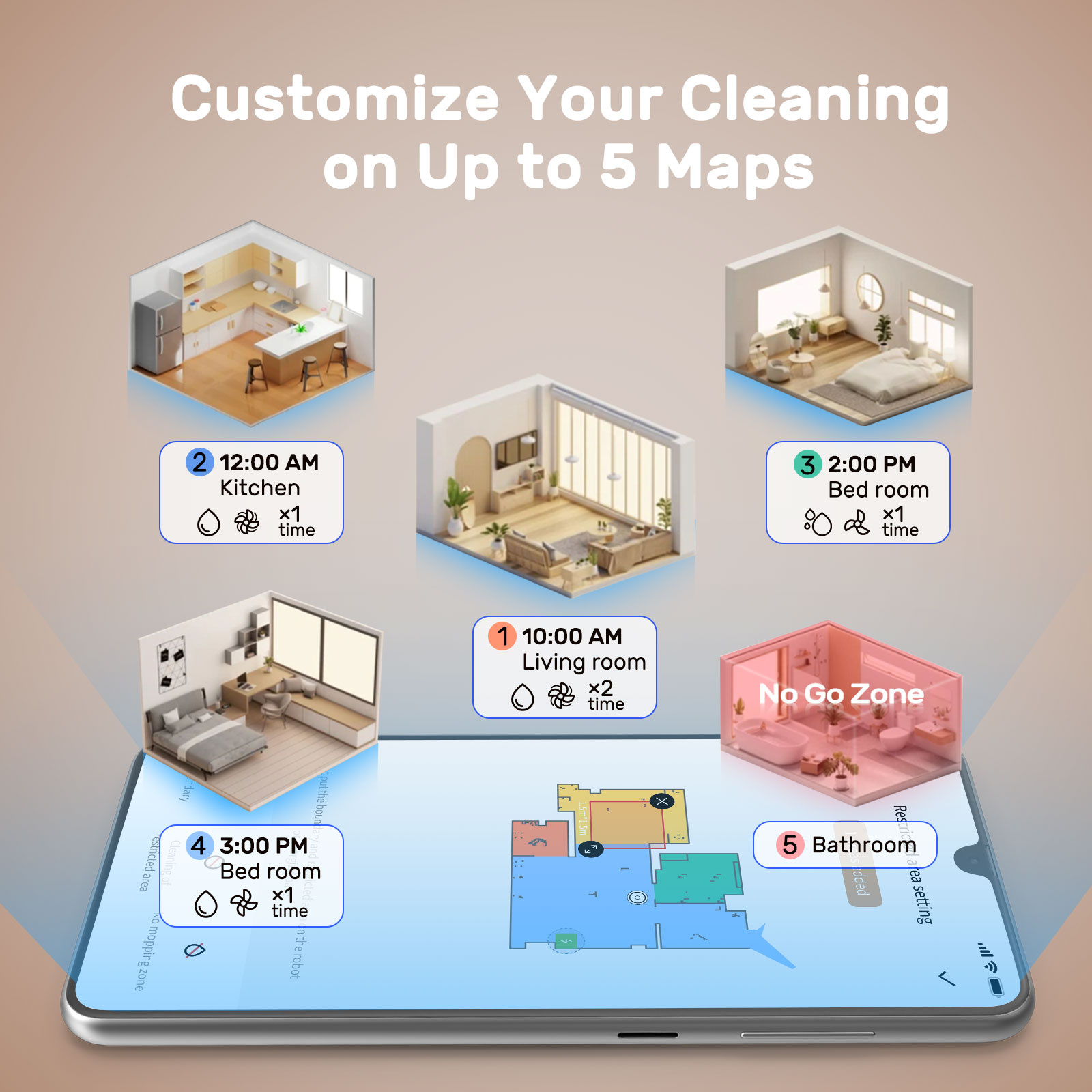 Effortlessly control and manage with the app for real-time mapping, multi-map management, virtual walls, automatic cleaning, room-specific cleaning, and scheduled cleaning.