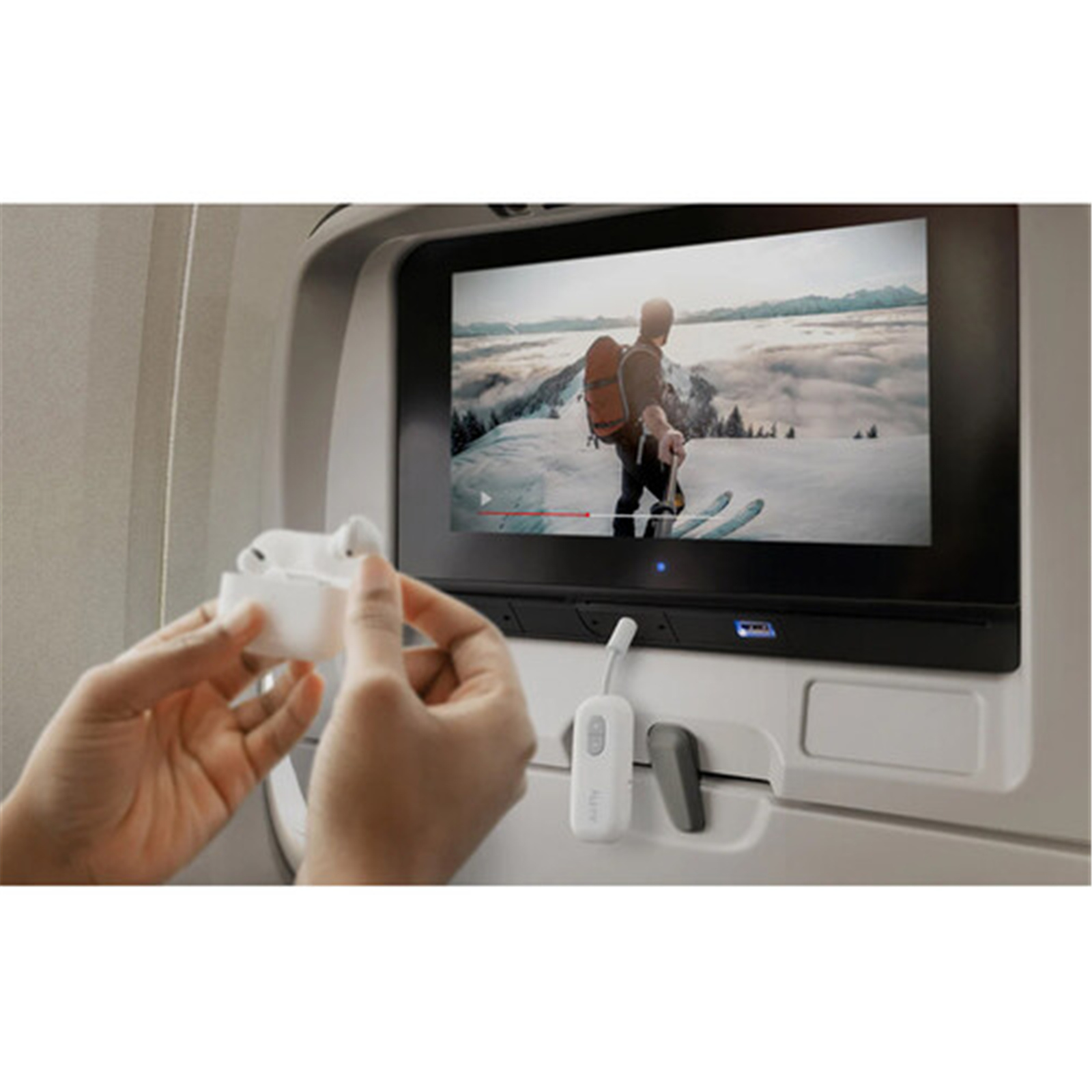 AirFly SE is the newest, easiest, most affordable way to listen to in-flight movies with your wireless headphones or earbuds. AirFly SE has a 20+ hour battery and a battery indicator so you know when it's time to recharge. New Volume controls let you turn sound up or down without touching the seat back screen. Mute the sound with two taps when the beverage cart arrives. Sounds great, doesn't it?