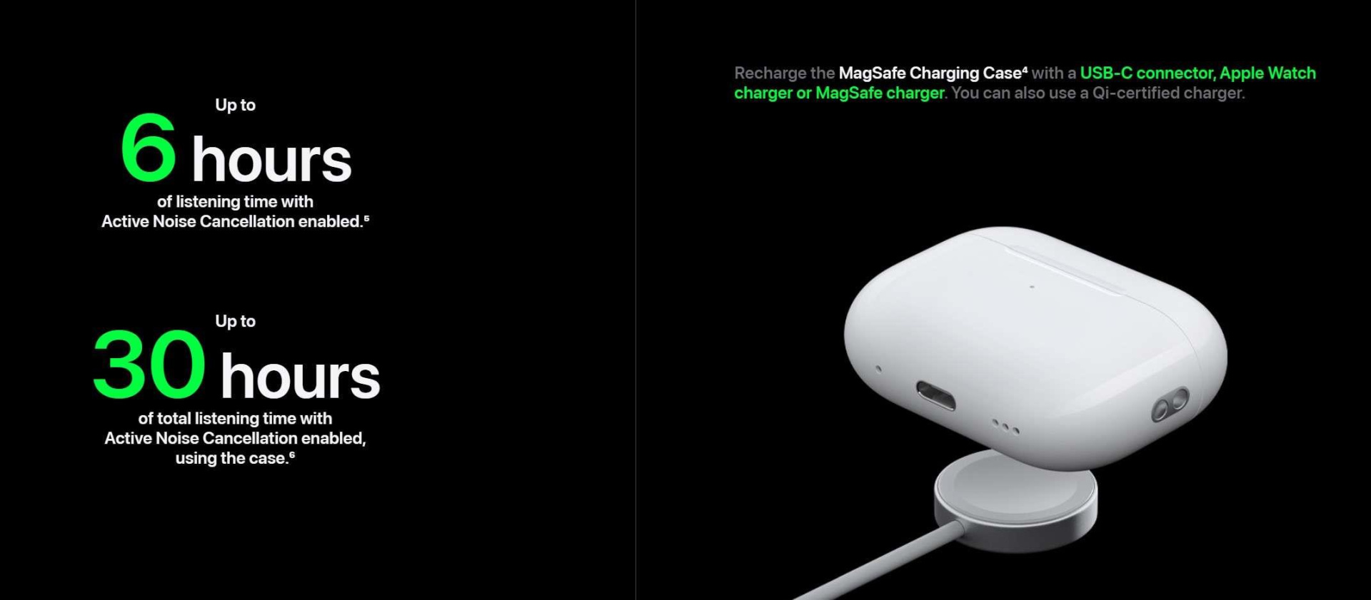 Up to 6 hours of listening time on a single charge (up to 5.5 hours with Personalised Spatial Audio and Head Tracking enabled)