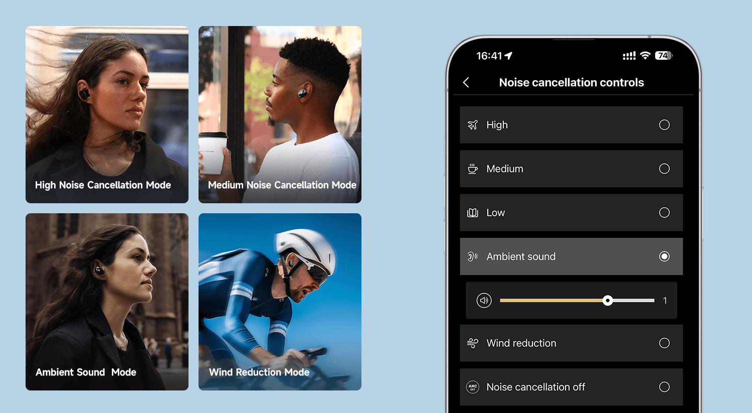 You can customize sound control with multiple noise cancellation modes and ambient sound levels to suit any situation.