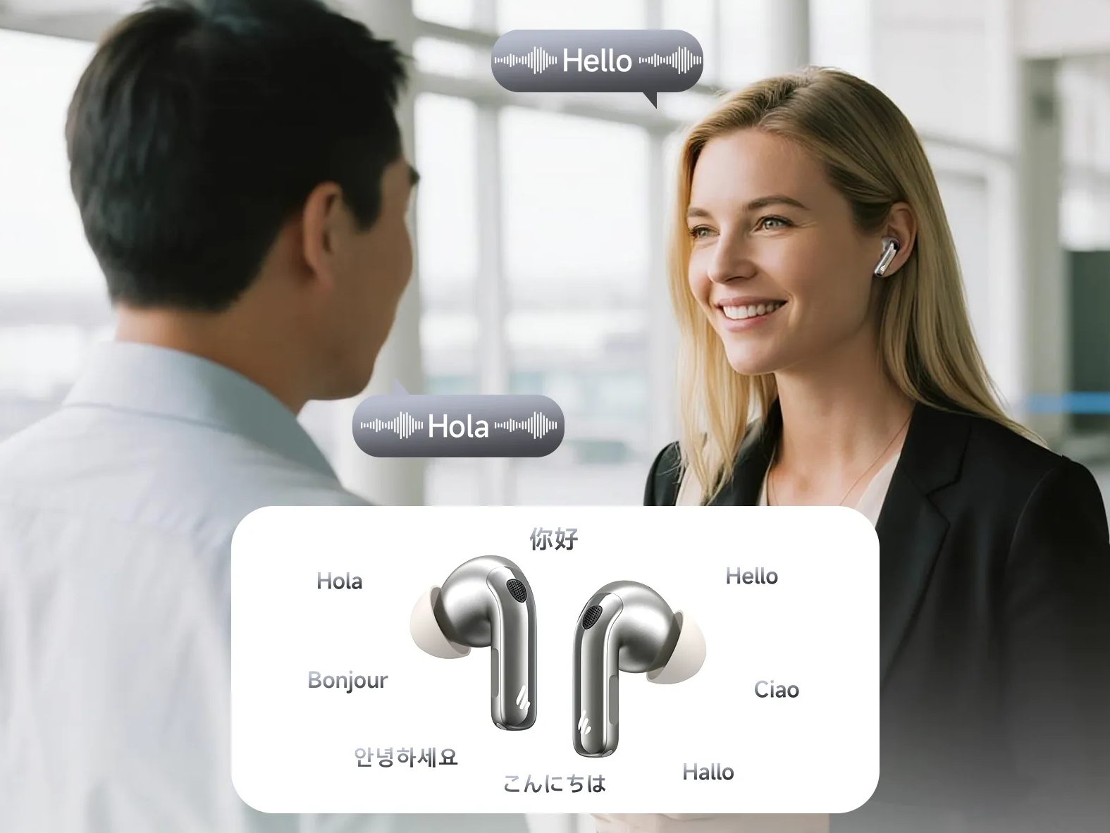 Enjoy seamless AI voice translation in 21 languages - perfect for travel, business abroad, and smooth global communication.