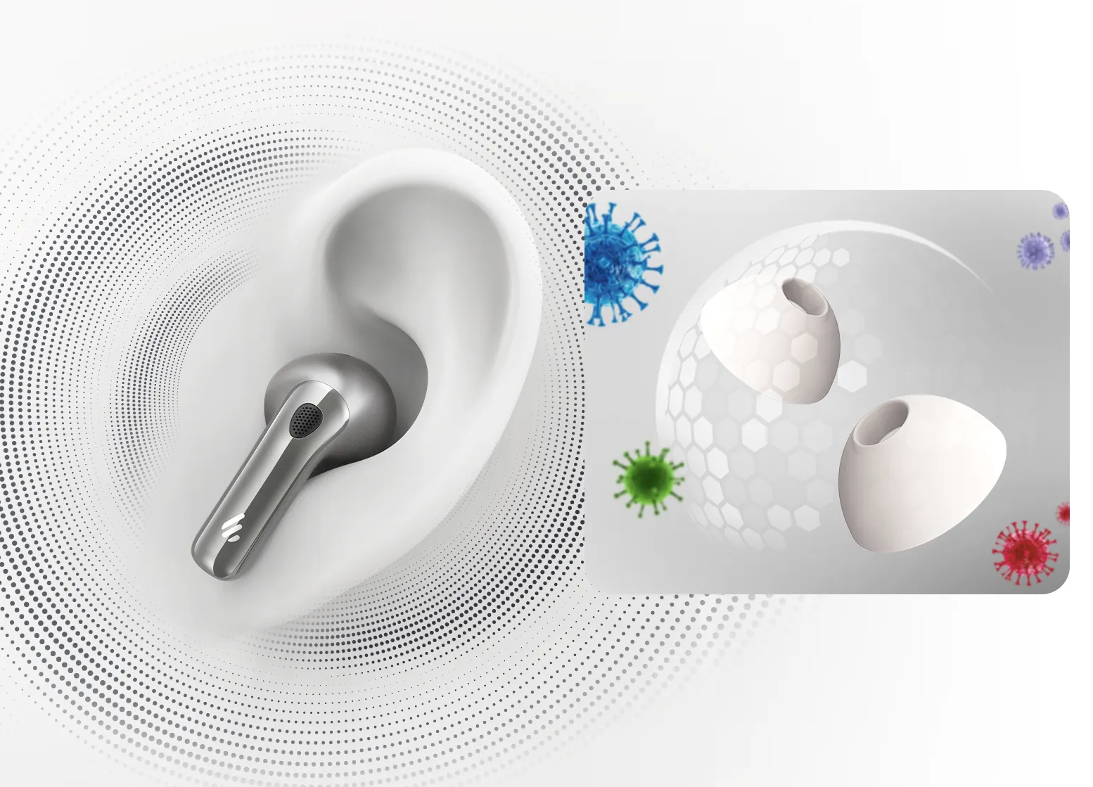 - Soft, secure, and hygienic antibacterial ear tips for all-day comfort.