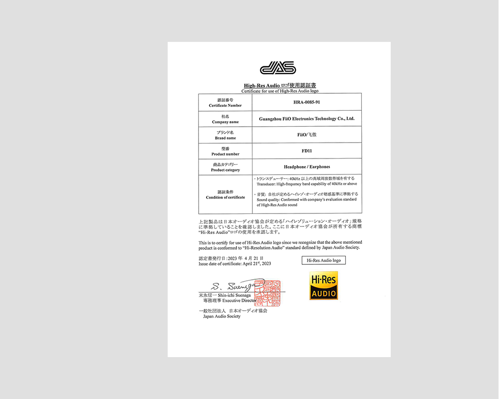 The FD11 is Hi-Res Audio certified, as established by the Japan Audio Society (JAS) and Consumer Electronics Association (CEA). It is a testament to the FD11's ability to accurately reproduce audio the way it was meant to be heard.