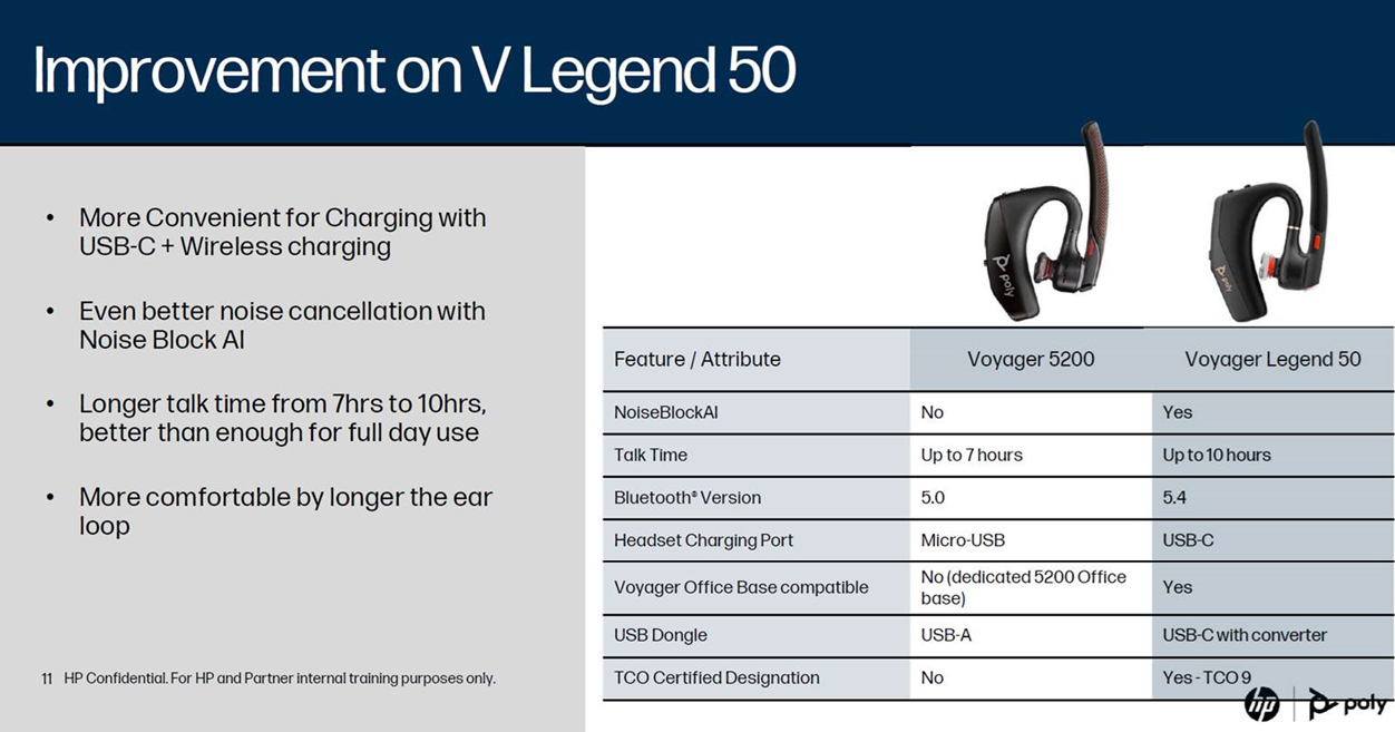 A legend revamped. Built over decades of innovation, lightweight and thoroughly tested for quality, the Poly Voyager Legend 50 Bluetooth® headset offers our most comfortable fit yet for all-day wear.