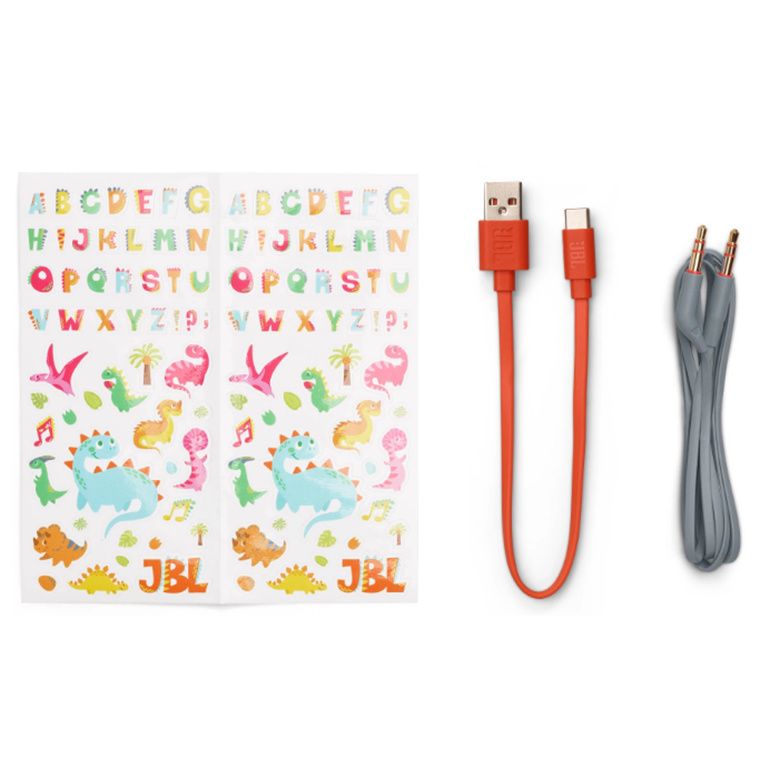 The plastic-free packaging folds into a fun device stand, and a playful JBL sticker set is included so kids can personalize their headphones.