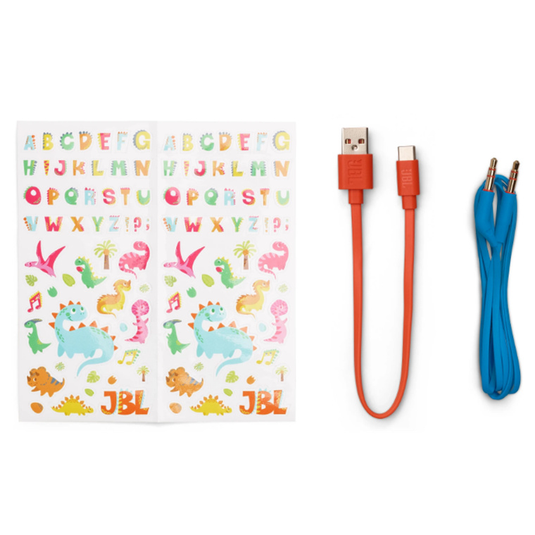 The plastic-free packaging folds into a fun device stand, and a playful JBL sticker set is included so kids can personalize their headphones.