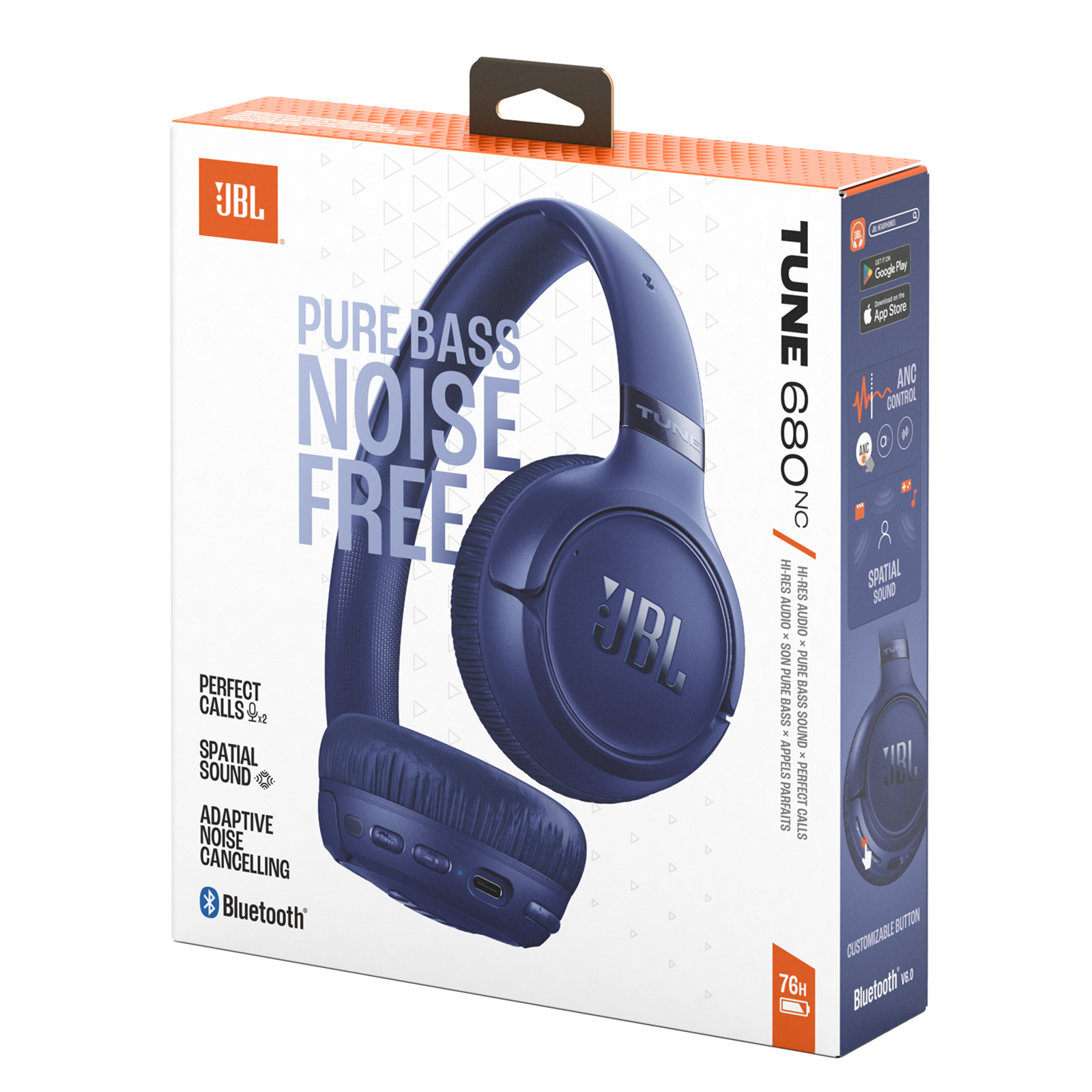 Your music takes center stage with JBL Tune 680NC wireless headphones. JBL Pure Bass Sound and immersive Spatial Sound surround you with crisp, powerful music, while Adaptive Noise Cancelling keeps you free from distractions. The sleek on-ear design with subtle metal accents makes a statement in your choice of stylish colors. Up to 76 hours of battery life means you can go a week between charges. And if you do need a top-up, 5 minutes gets you another 5 hours, or just plug in the detachable headphone cable to stay in the groove. With 2 mics that accurately pick-up your voice, calls sound perfect on both ends. Seamless Bluetooth® switching makes it easy to stay connected across devices, while the JBL Headphones app lets you tailor the sound of your music and crystal-clear calls with ease. They're lightweight enough to wear all day, and foldable so they slip easily into any bag when the music's over. From morning podcasts to all-night playlists, JBL Tune 680NC headphones are built to keep up and stand out.