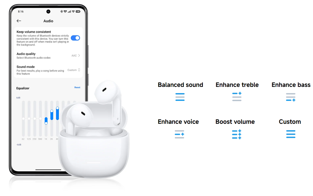 [2] Please download the Xiaomi Earbuds app to enjoy audio balance adjustments. For phones running Xiaomi HyperOS 3 and above, EQ settings can also be set via the Bluetooth settings page.