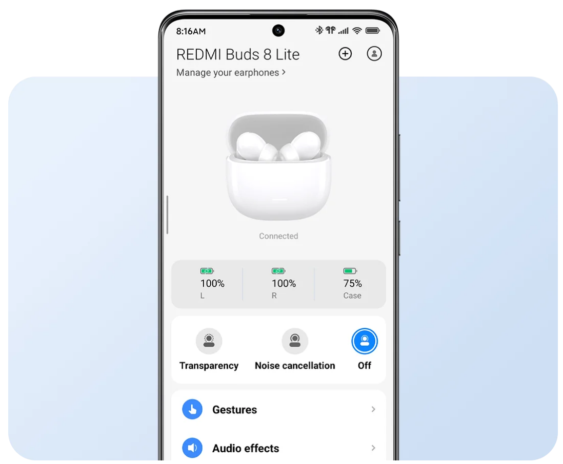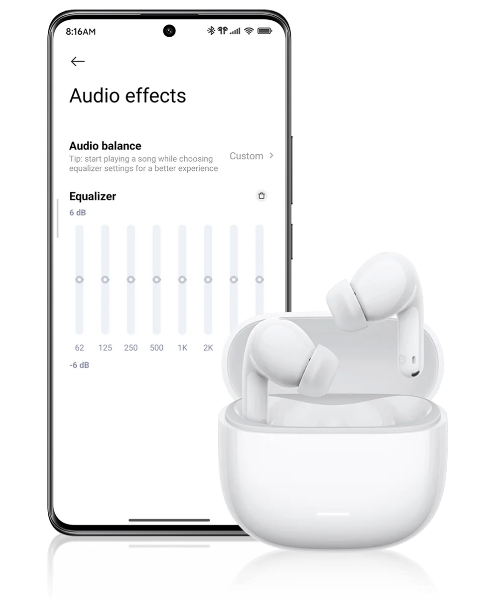 Download the Xiaomi Earbuds app to unlock more personalized features. Adjust noise-cancellation modes to suit different scenarios, use the equalizer to match your preferred sound profile and customize touch gestures for more intuitive control. The app also supports firmware updates to continuously optimize your experience.