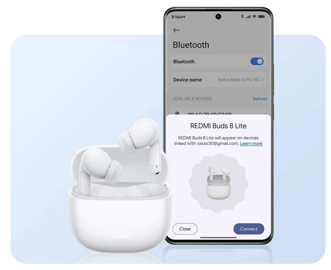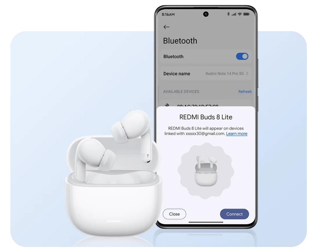 REDMI Buds 8 Lite features a large-diaphragm driver that delivers a wide dynamic range, giving the sound expressive depth. The titanium-coated interior enhances audio resolution, making sound clearer and more detailed, while providing a balanced and rich performance across all frequencies. From deep, full bass to warm mids and crisp highs, experience distinct layers for a rich and immersive listening experience.