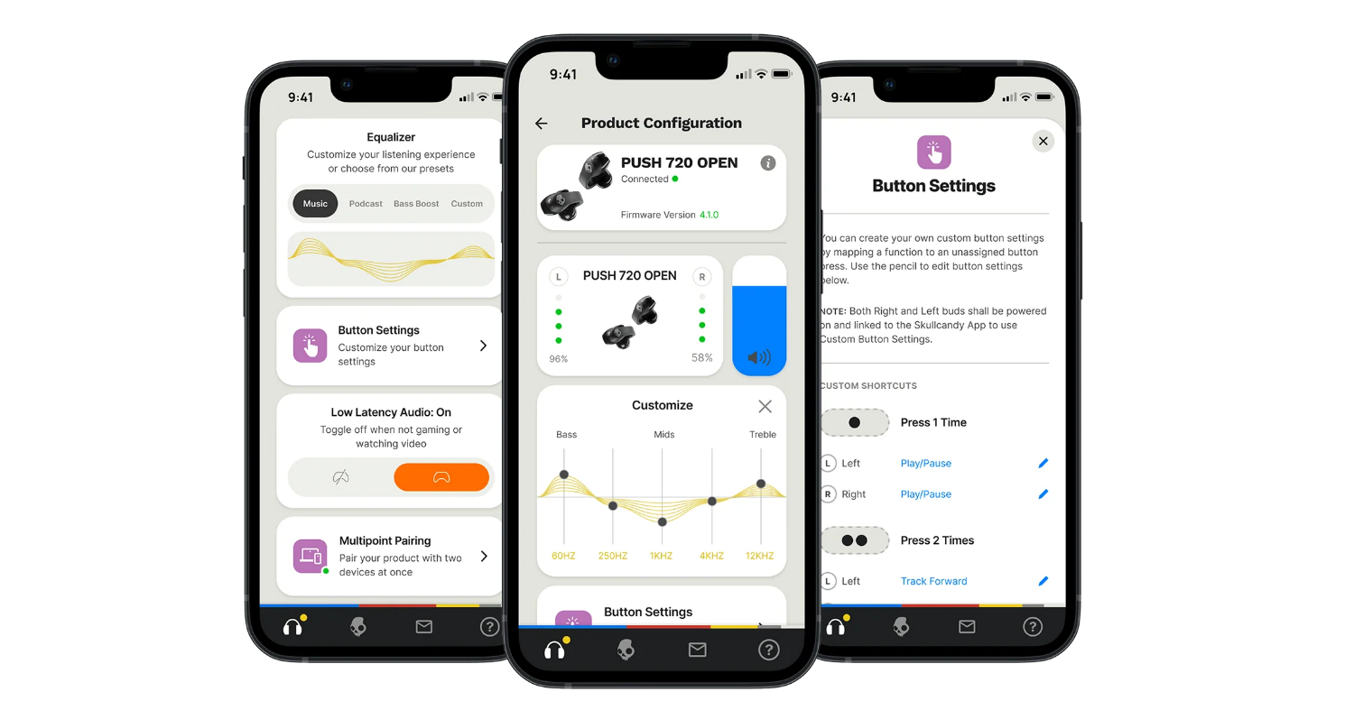 Enhance your listening experience with the Skullcandy App. Customize EQs or chose from presets, configure button settings and trigger a photo from your earbud.