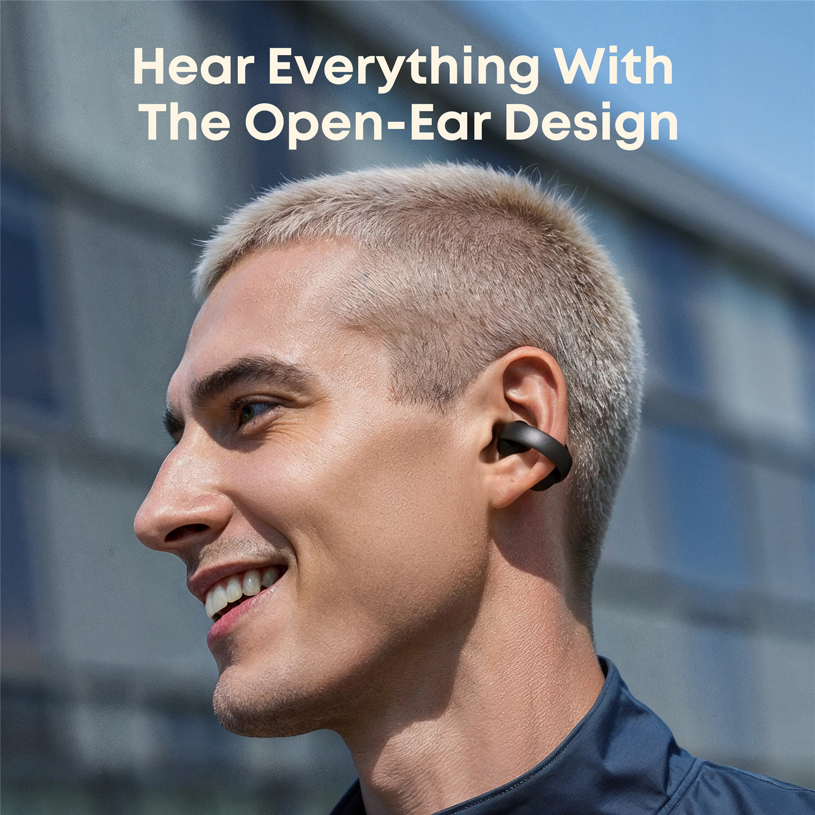Flexible, Secure Fit: soundcore AeroClip clip-on earbuds boast an adaptive open-ring design that endures 20,000 bends. Feather-light and flexible, they stay secure for all-day wear.