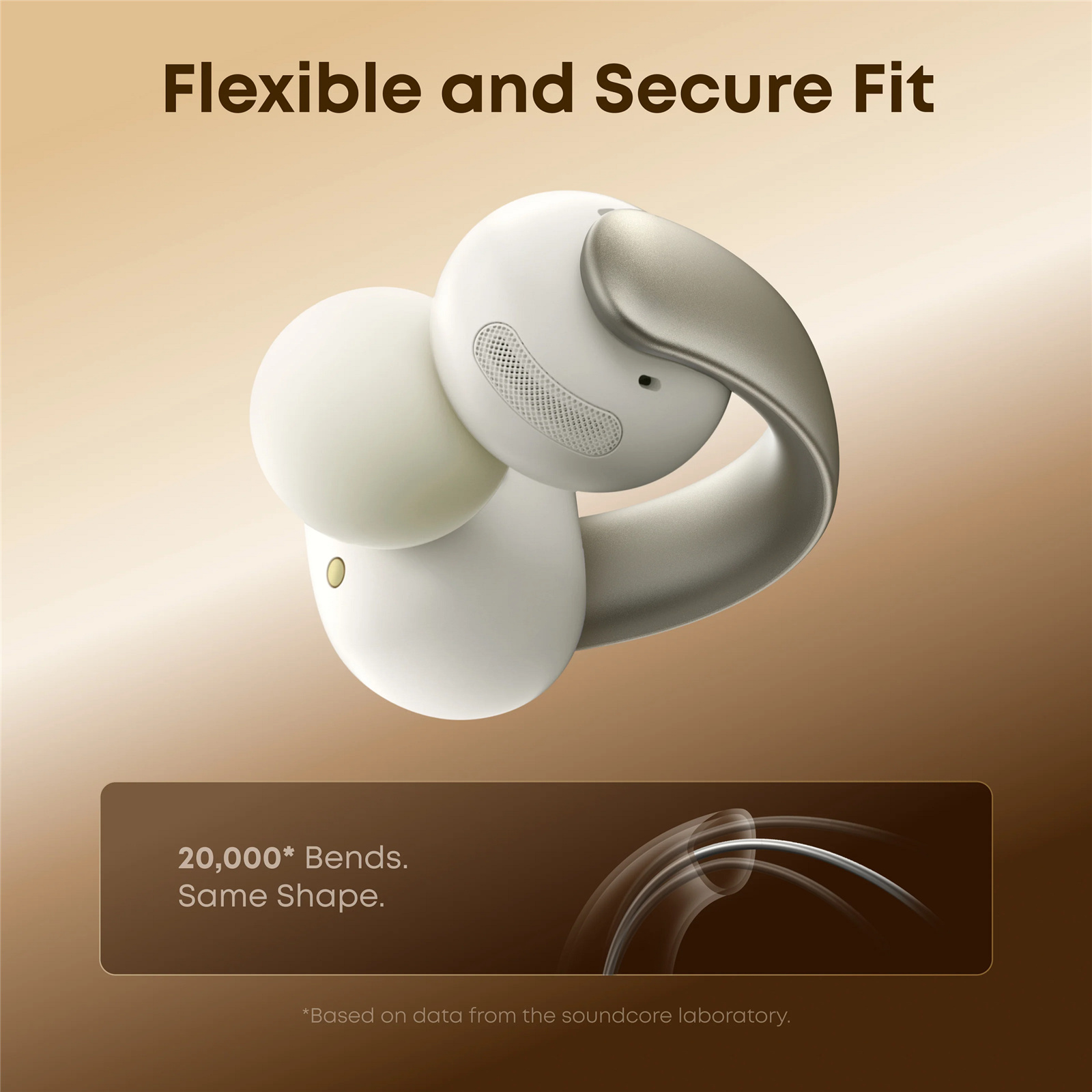 Flexible, Secure Fit: soundcore AeroClip clip-on earbuds boast an adaptive open-ring design that endures 20,000 bends. Feather-light and flexible, they stay secure for all-day wear.