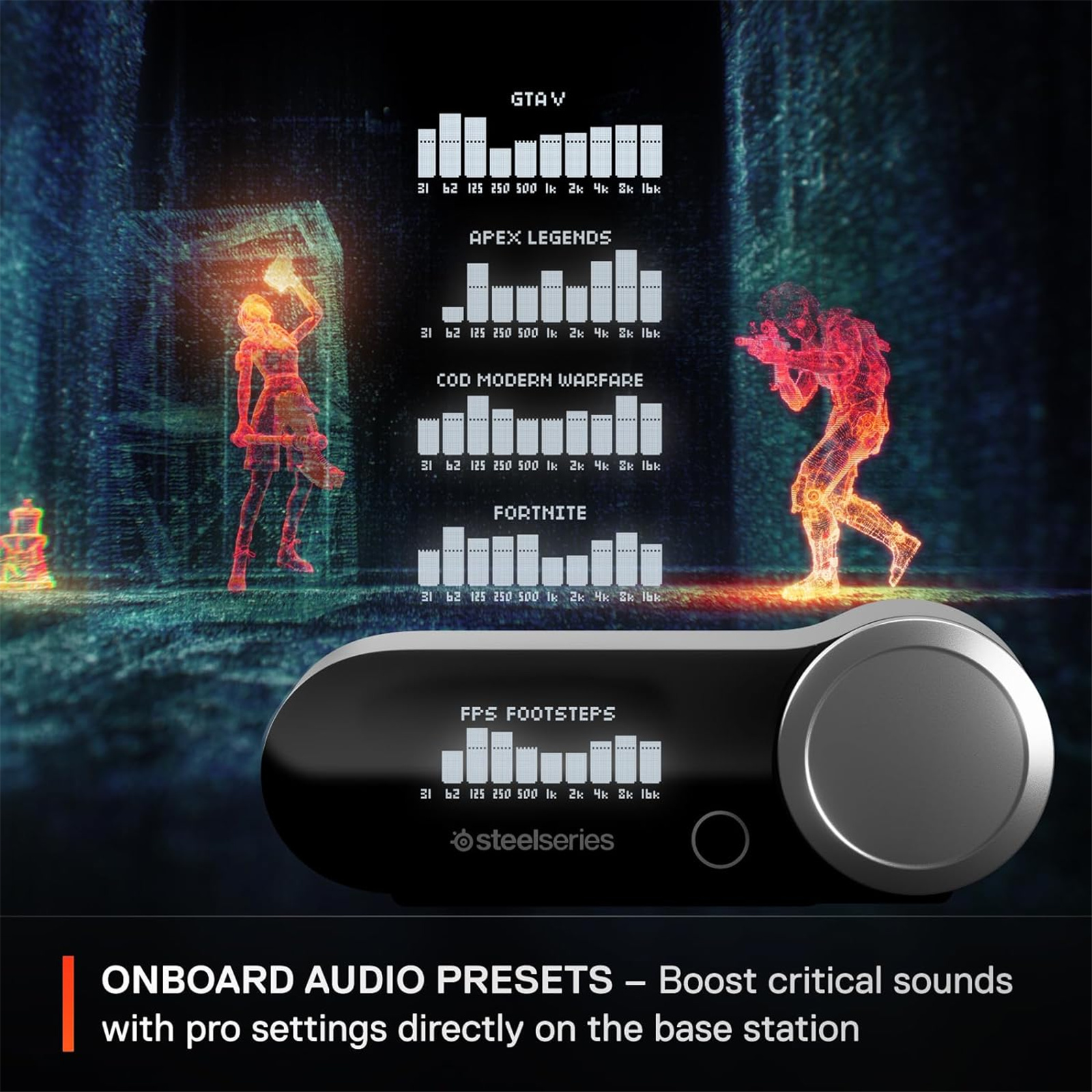 You could spend 30 minutes fine tuning sound settings. Or you could let SteelSeries audio engineers, game devs & pro players do it for you. Featuring over 100 presets including Fortnite, Apex Legends, Minecraft and many more.