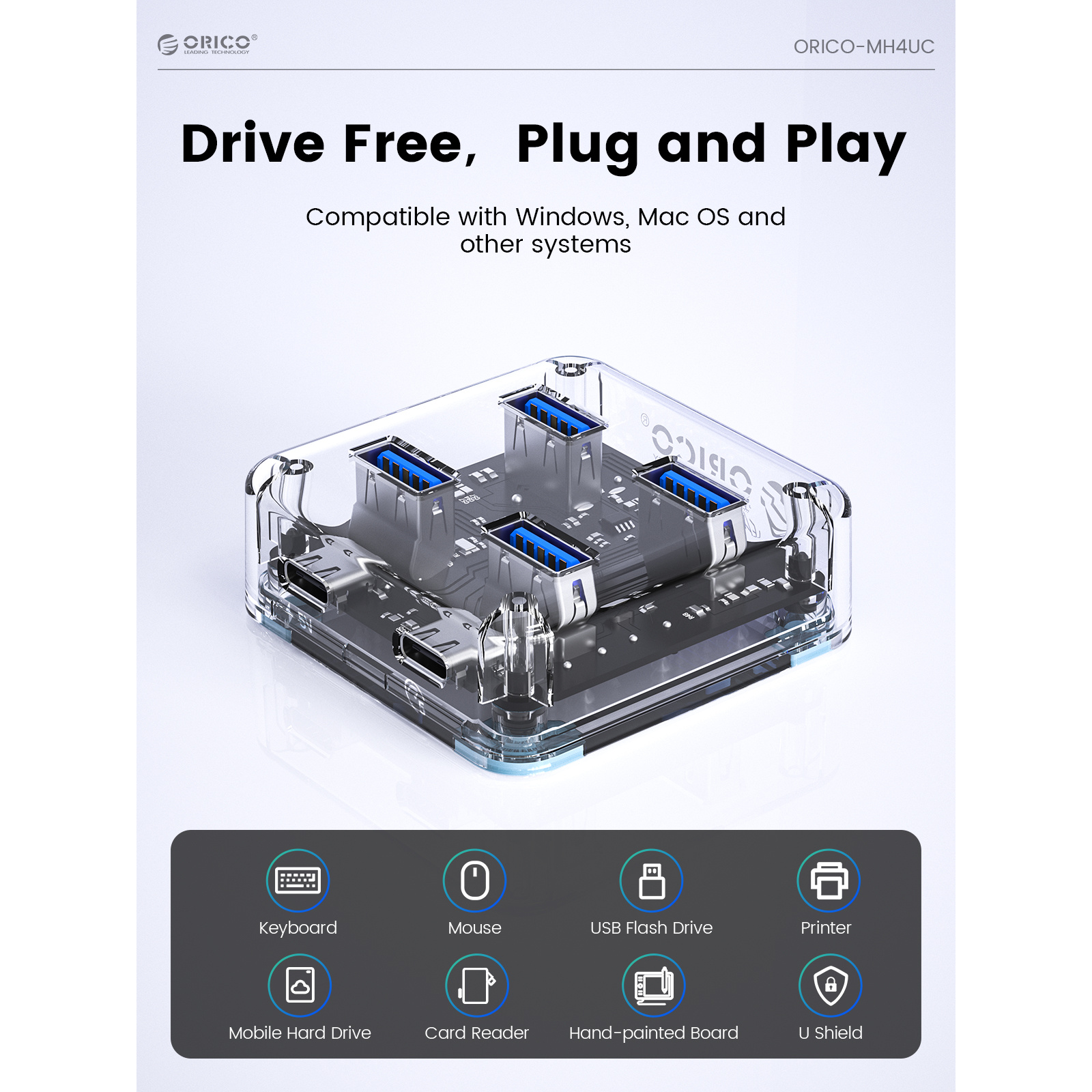 Orico MH4UC-C3-10-CR-BP USB-C to 4x USB-A 5Gbps Transparent HUB Includes USB-C to UBS-C Cable