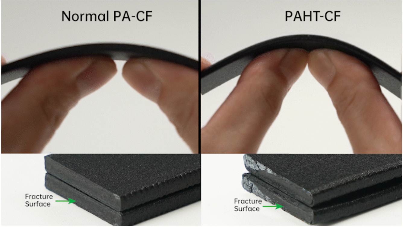 Bambu PAHT-CF shows much higher adhesion in Z layers compared to normal PA-CF,