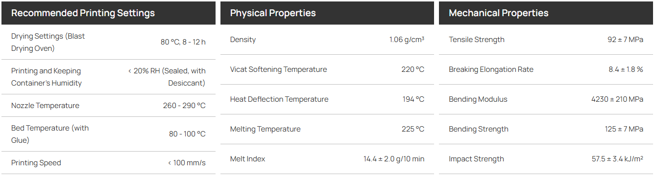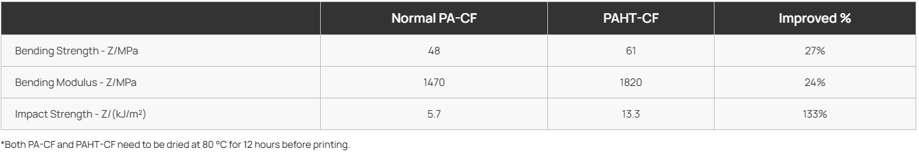 The heat deflection temperature of Bambu PAHT-CF is up to 194℃ (0.45MPa)*, making it useful in applications where the printed parts may be exposed to high temperatures without deforming or losing their strength.