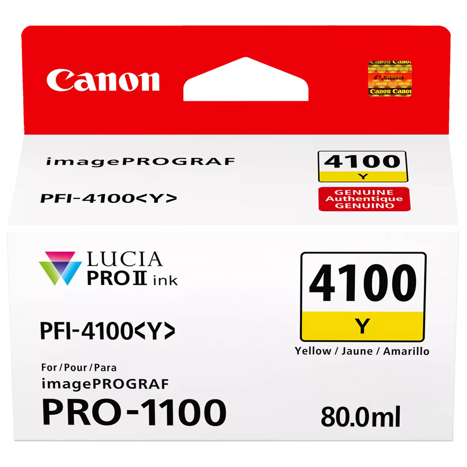 The PFI-4100 Yellow Pigment Ink Tank from Canon is compatible with their imagePROGRAF PRO-1100 printer and uses the LUCIA PRO II ink system to produce images with accurate color, greater clarity, and enhanced darker areas. This tank has a capacity of 80ml.
