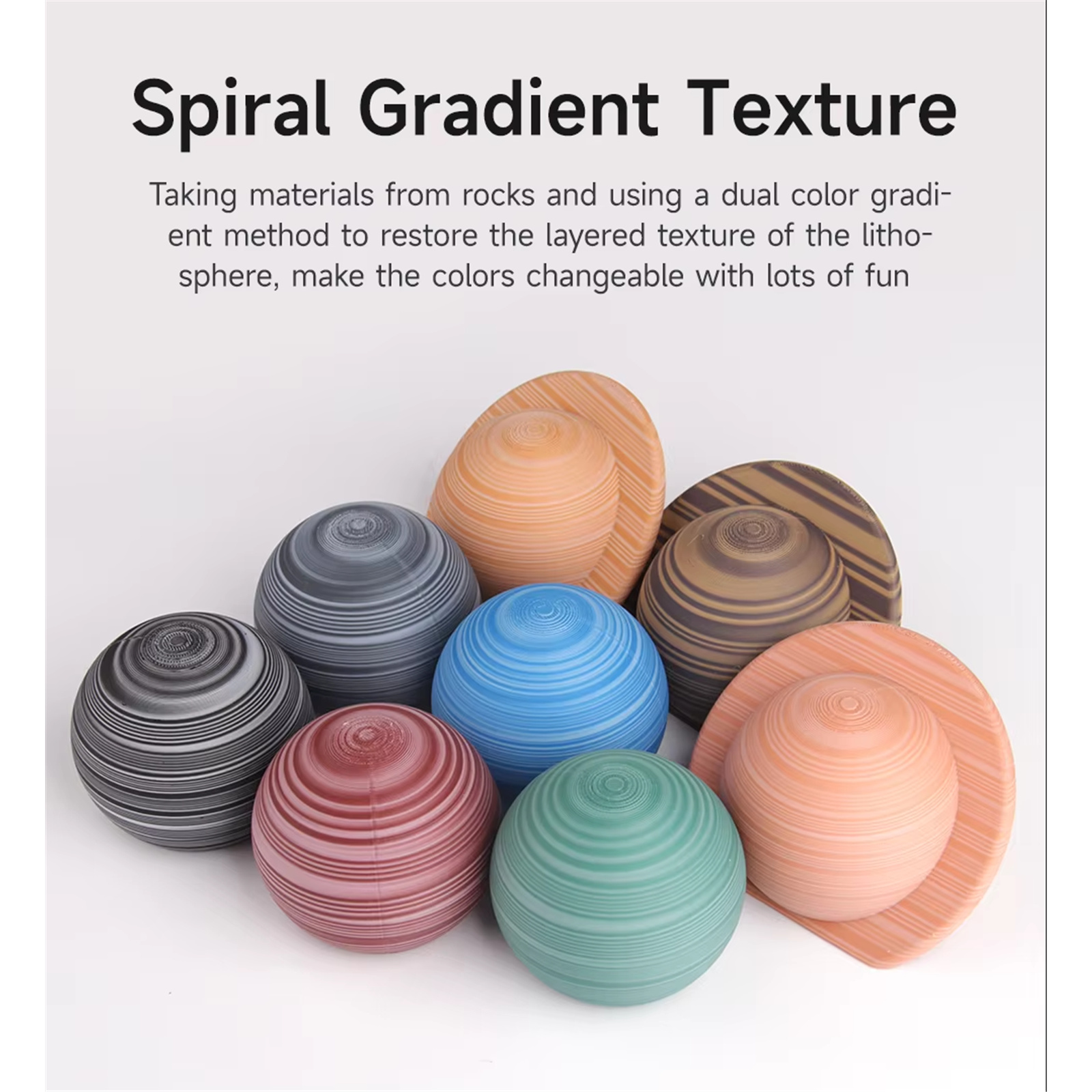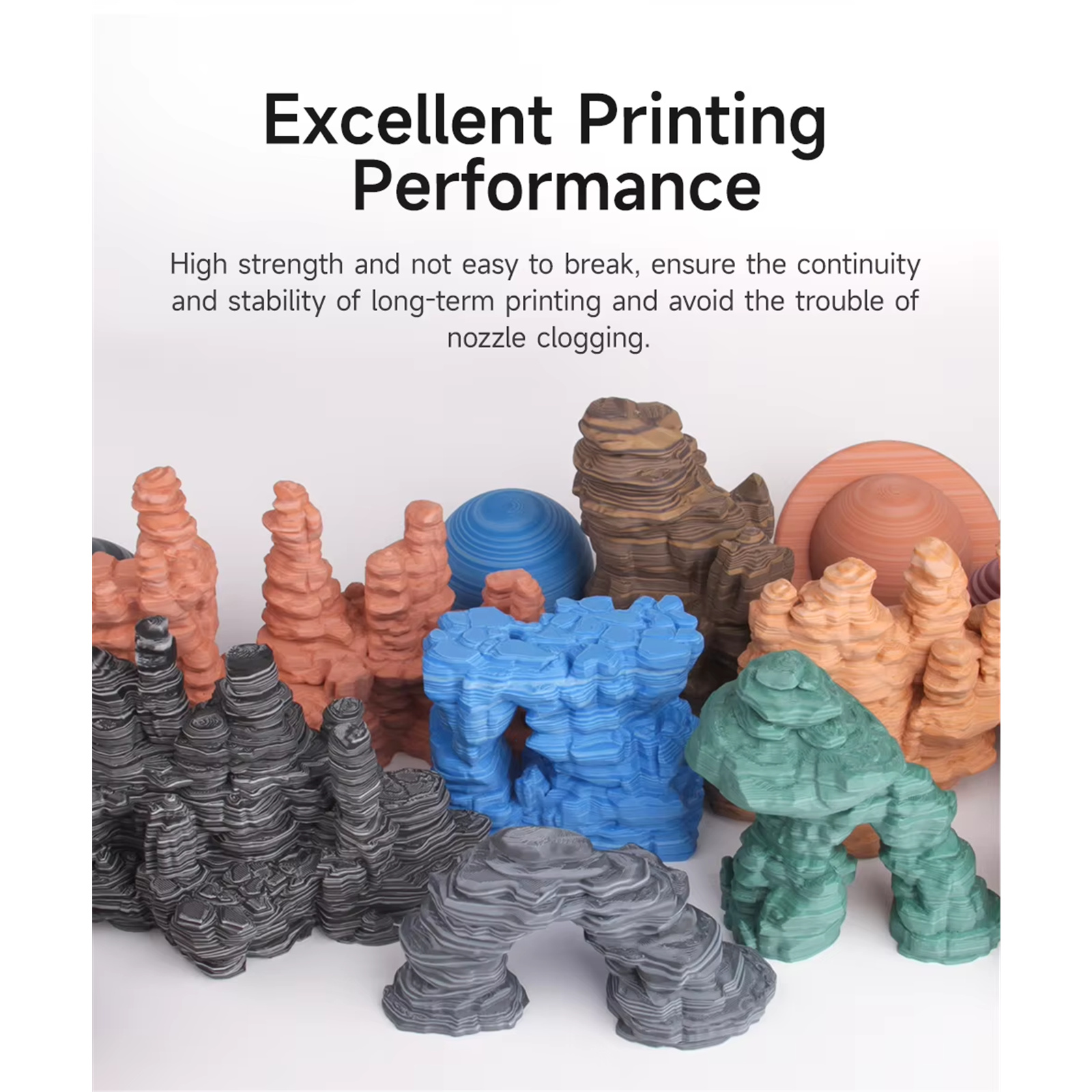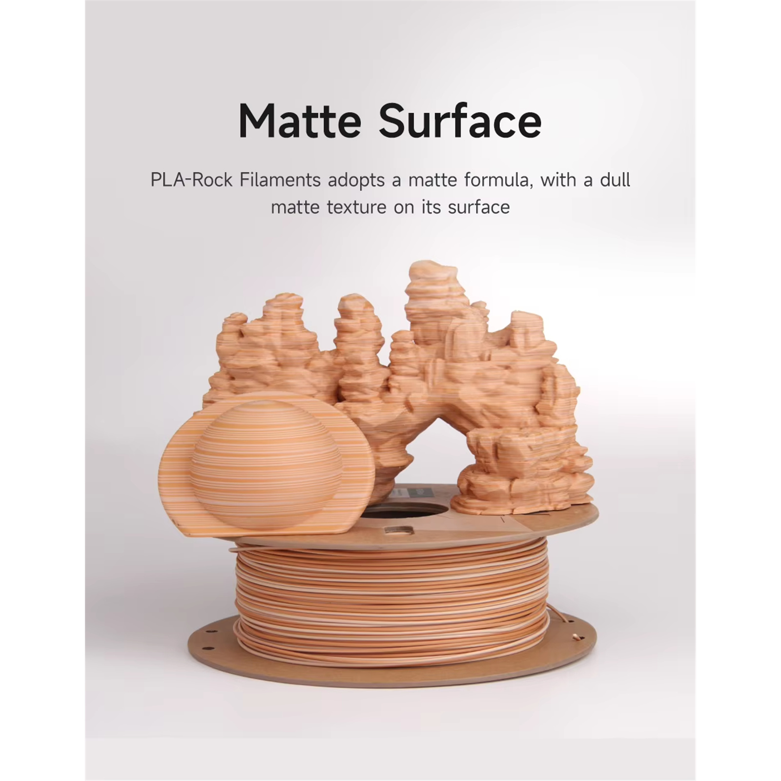 PLA rock using matte formula, create a dull and frosted surface, reproducing the color of the rock, the two-color gradient method restored the layered texture of the rock circle. The color change of the products is full of creativity. The strength of PLA-Rock is high and the filament is not easy to break, ensuring the continuity and stability of long-term printing and avoiding the trouble of nozzle clogging.