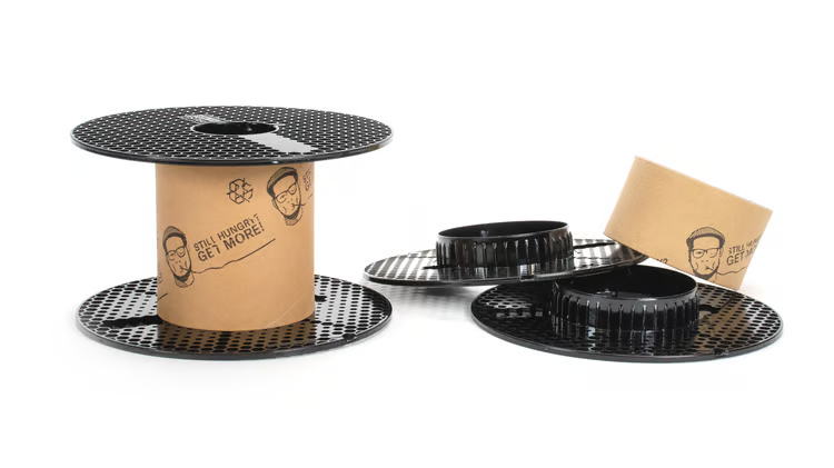 We are constantly improving our filament spools. The latest iteration features a core from recycled cardboard and lightweight sides from recycled polycarbonate.