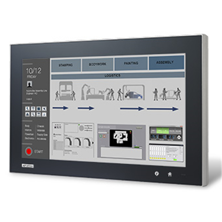 - Front panel module with P-CAP multi-touch sensor available in various sizes (12" and 19" module is equipped with 5-wire resistive touch control)