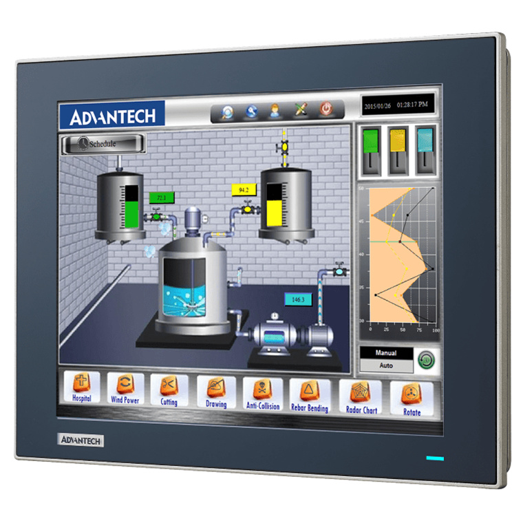 - True-flat touchscreen with 5-wire resistive touch control and IP66-rated front panel