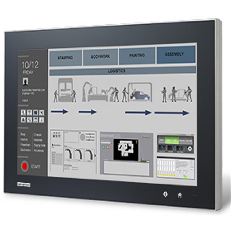 - True-flat touchscreen with 5-wire resistive touch control and IP66-rated front panel