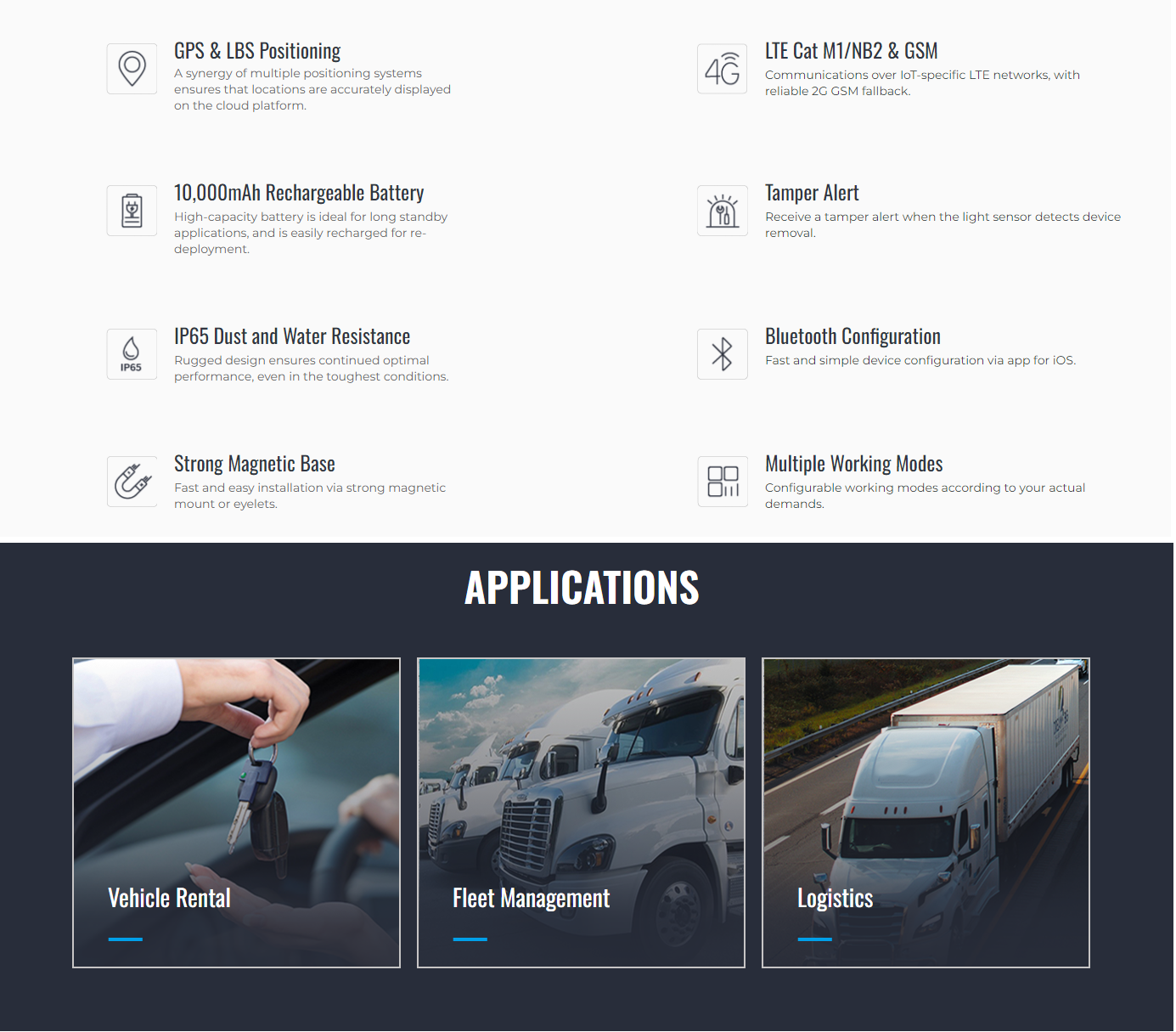 The JM-LL01 is a Cat M1/NB-IoT asset tracker with ultra-long standby time. Depending on reporting frequency, its low consumption internal battery can provide up to 3 years of working time on a single charge. The JM-LL01's strong magnetic mount allows for effortless installation onto almost any metal surface, and a light sensor will be triggered and an alert sent once detachment occurs, helping users to feel totally assured that their assets are under constant protection.