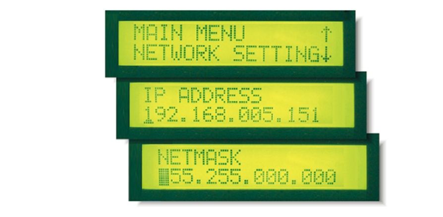 An LCD panel is built into the NPort® 5400's top panel, with four buttons for data input, configuration, and operation mode selection. The LCD panel displays the server name, serial number, and IP address, and it can be used to enter or modify parameters such as IP address, netmask, and gateway. (The LCD panel is not available on wide-temperature models.)