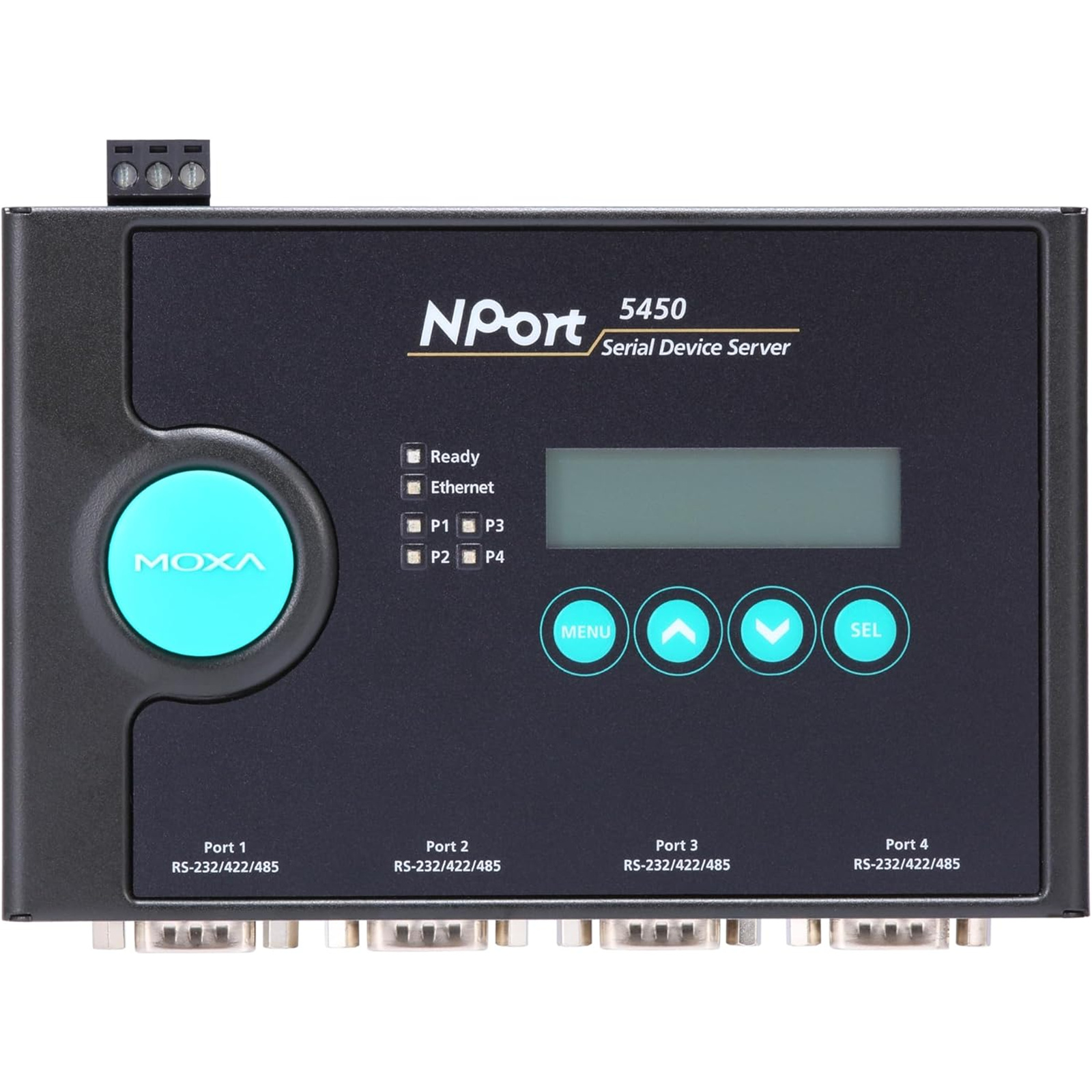 NPort® 5400 device servers provide many useful features for serial-to-Ethernet applications, including an independent operation mode for each serial port, user-friendly LCD panel for easy installation, dual DC power inputs, and adjustable termination and pull high/low resistors.