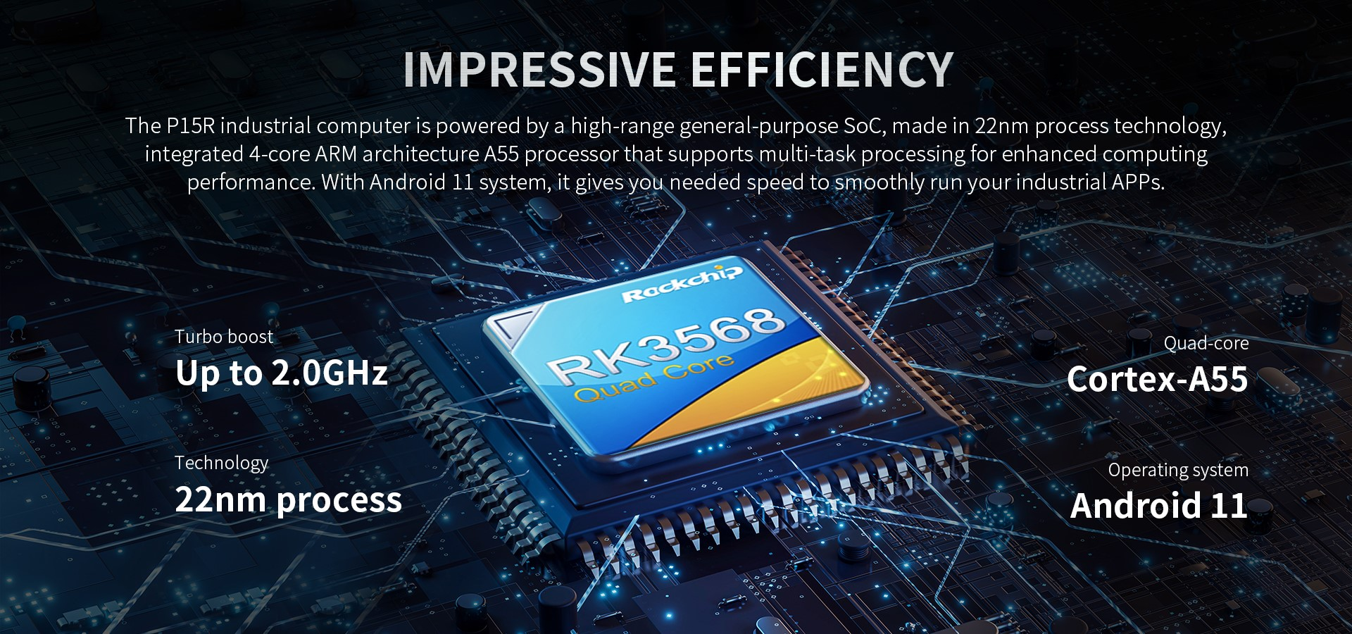 P15R is a 15.6-inch flat panel pc, equipped with ARM-based Rockchip processor and Android 11 operating system, which offers a powerful, cost-effective, stable and easy to use solution to industrial requirements. And with HMI, fully enclosed design, fanless cooling system, rich I/O interfaces, international Wi-Fi, various installation methods, it can reach the industrial-level performance and quality standards, and can be applied in a wide range of industrial scenarios, like industrial production workshops, industrial automation equipment, and monitoring systems.