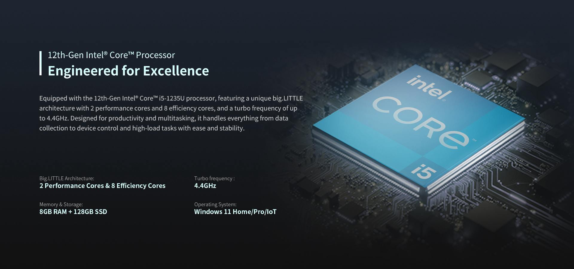 Equipped with the 12th-Gen Intel® Core™" i5-1235U processor, featuring a unique big.LITTLE architecture with 2 performance cores and 8 efficiency cores, and a turbo frequency of up to 4.4GHZ. Designed for productivity and multitasking, it handles everything from data collection to device control and high-load tasks with ease and stability.