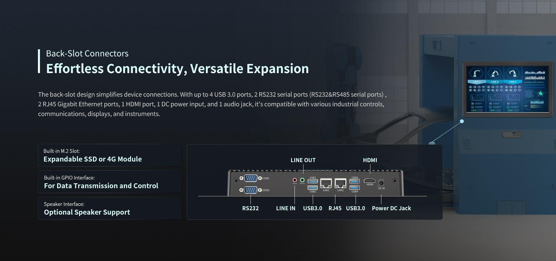 Multiple Networking: Wi-Fi 6 and BT 5.1; Supports 4G network connectivity, multiple interfaces: USB, RS232, RJ45, HDMI, and audio ports.