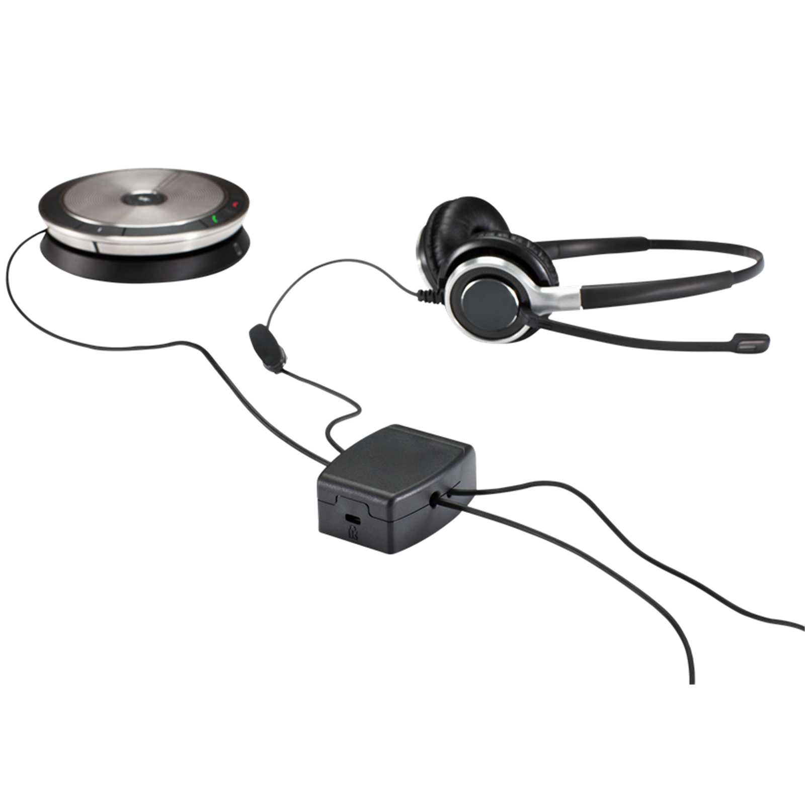 The security cable lock safely attaches devices such as speakerphones, headsets and web cameras to tables in meeting rooms and to desks. The patent-pending design prevents inconvenient borrowing and reduces the risk of theft, ensuring that the device remains where it was placed. The security cable lock is simple to use and install; users simply insert the cable(s) and close the lock.